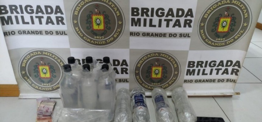 Após a abordagem e busca pessoal, foram apreendidos três porções de substância idêntica a crack, aproximadamente 100 gramas, dez garrafas de cachaça embaladas para arremesso, um smartphone, um rolo de fita crepe e a quantia de R$ 75,00 em moeda corrente.