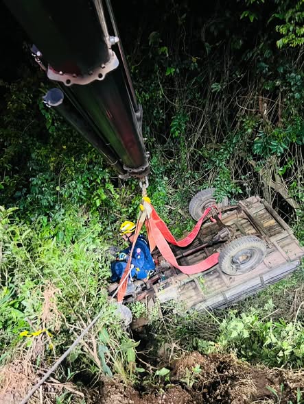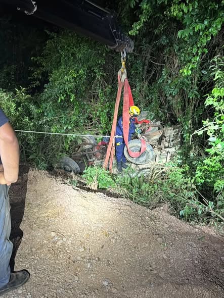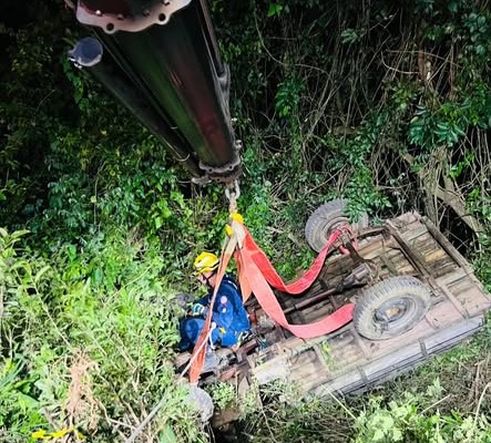Por se tratar de um local de difícil acesso, foi necessário o uso de um caminhão munk para efetuar a remoção do veículo e da vítima.