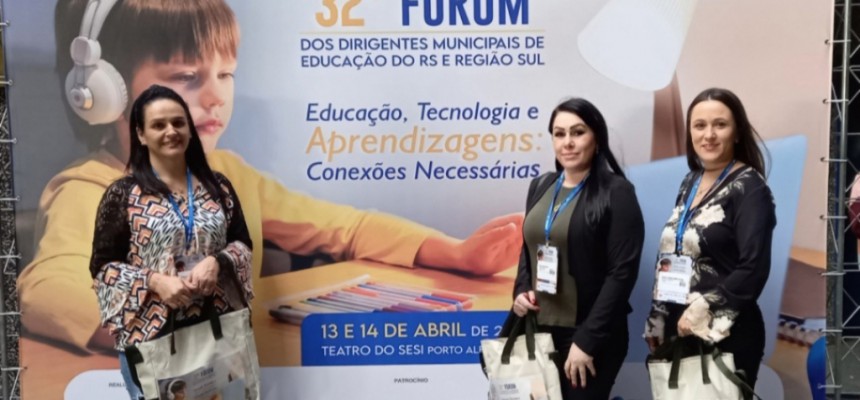 Com o tema “Educação, Tecnologia e Aprendizagens: conexões necessárias”, o 32º Fórum dos Dirigentes Municipais de Educação do RS e Região Sul foi realizado no Teatro do Sesi/Fiergs, em Porto Alegre, nos dias 13 e 14 de abril. O evento promovido pela União Nacional dos Dirigentes Municipais de Educação (Undime/RS) reuniu 1.027 profissionais, entre eles a Secretária Municipal de Educação e Cultura de Machadinho, Eveline Webber Betiolo da Rosa, Zuleica Roberta Paixão, coordenadora pedagógica da Educação Infantil e Mônica Pelicer, coordenadora pedagógica dos Anos Iniciais do Ensino Fundamental.