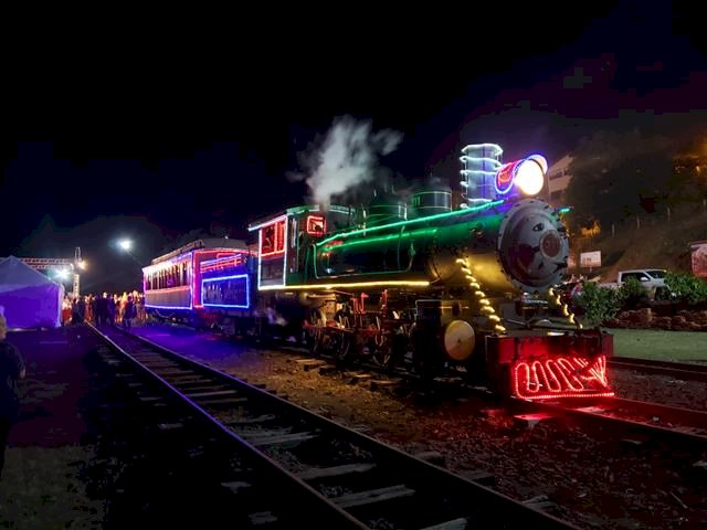 Por volta das 20h30, a centenária Maria Fumaça trouxe o Papai Noel, que foi recebido pelo prefeito, Vannei Mafissoni, e o presidente da Associação dos Amigos da Ferrovia, Jonas Kerber.