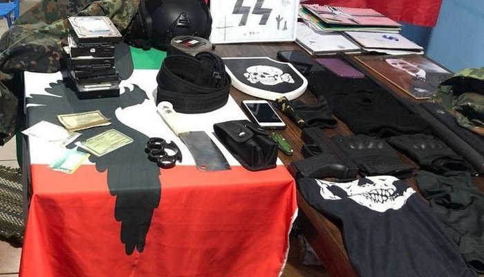 A polícia encontrou bandeiras e fotos nazistas e fascistas, imagens de Adolf Hitler e Benito Mussolini, simulacro de arma de fogo, facas, canivetes, fardas camufladas e capacetes. De acordo com o delegado Marco Antônio, os pais do adolescente também foram detidos.