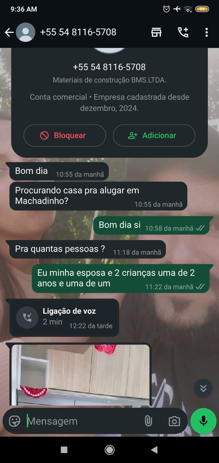 Além da foto, o criminoso enviou um vídeo mostrando o interior de uma casa, afirmando que o imóvel ficava próximo da UBS de Machadinho, onde uma imobiliária realmente possui casas para locação. Tudo parecia legítimo para a vítima.