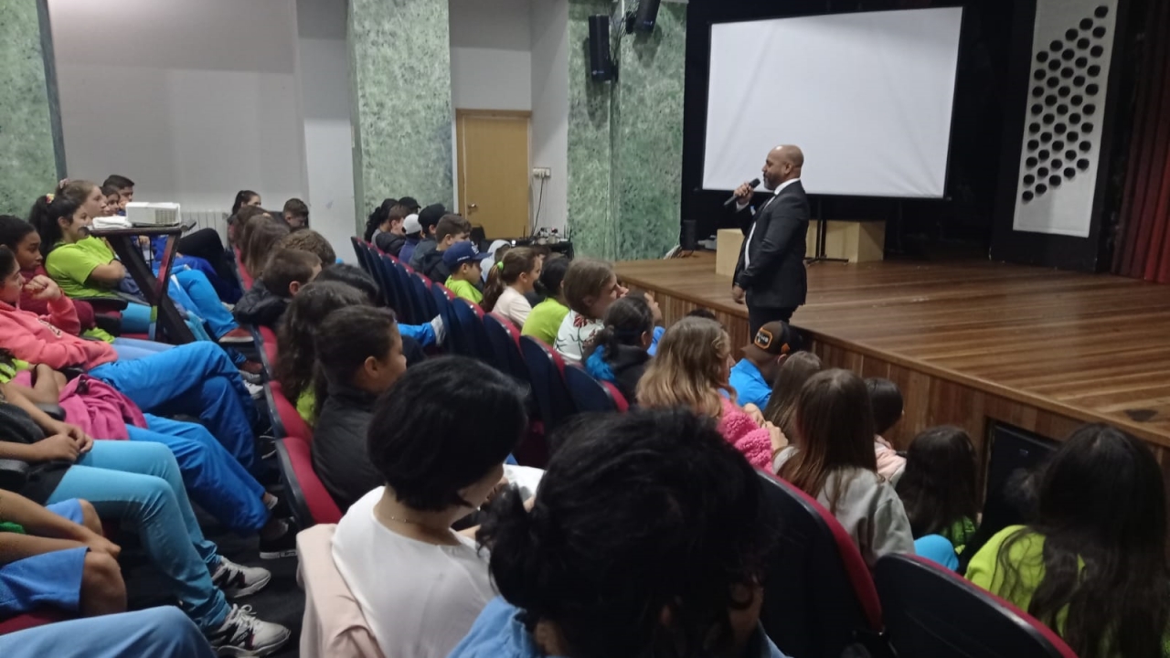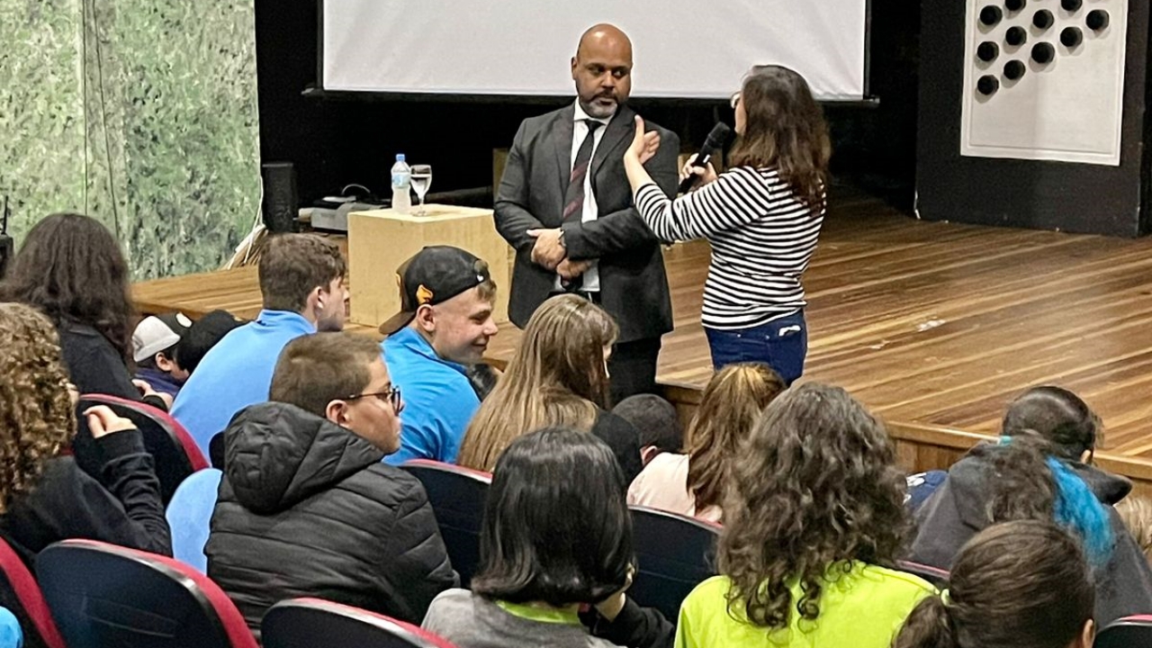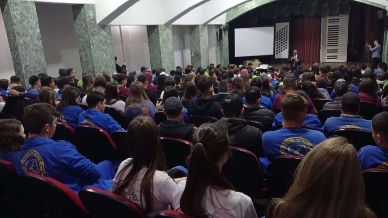 Em sua intervenção, o Dr. Rafael mencionou sobre os perigos do uso de álcool e drogas, consequências para a saúde, para o relacionamento familiar e para a escola. Falou também sobre o respeito com professores, sobre o cumprimento das regras da escola e o cuidado com o patrimônio público do qual utilizam.