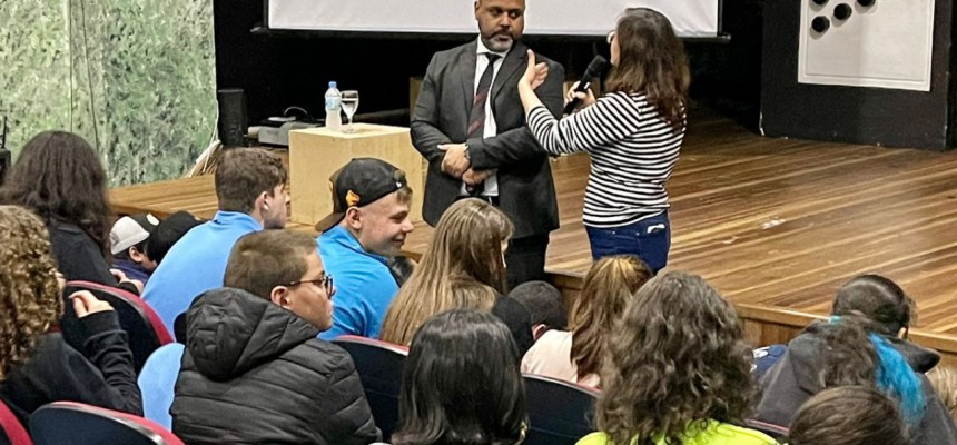 Na manhã da última sexta-feira (06), esteve em visita no município de Machadinho o Exmo. Sr. Juiz de Direito da Comarca de São José do Ouro, Dr. Rafael Alessandro Pereira Olympio. Na oportunidade, ele conversou com os alunos da Escola Municipal Muriam Piovesan de Lima e com alunos da Escola Estadual de Ensino Médio Castro Alves. Os temas abordados foram relacionados a direitos, deveres e possíveis punições quando houver infrações e desrespeito no ambiente escolar.