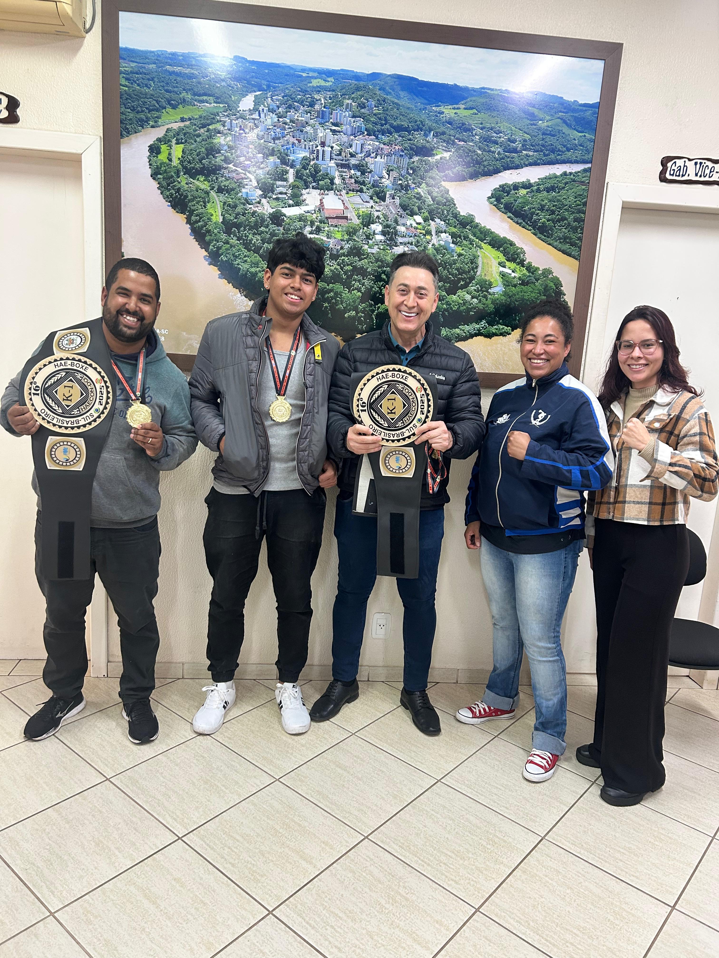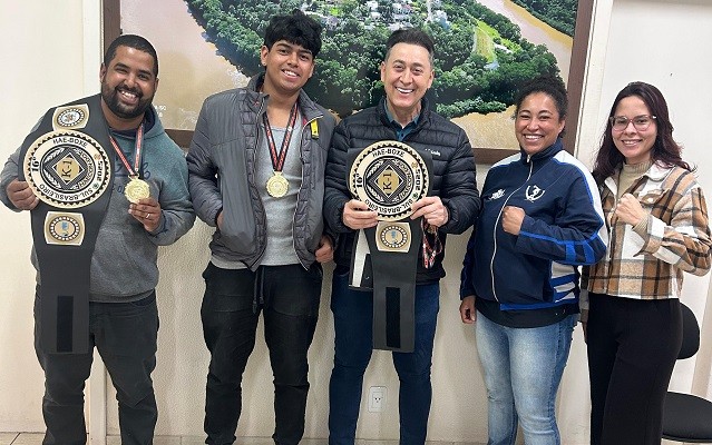 Na manhã desta segunda-feira (04), os campeões estiveram no Gabinete do Prefeito Vanderlei Weber para apresentar os cinturões e medalhas conquistados na competição. A visita foi marcada por reconhecimento e incentivo ao esporte local.