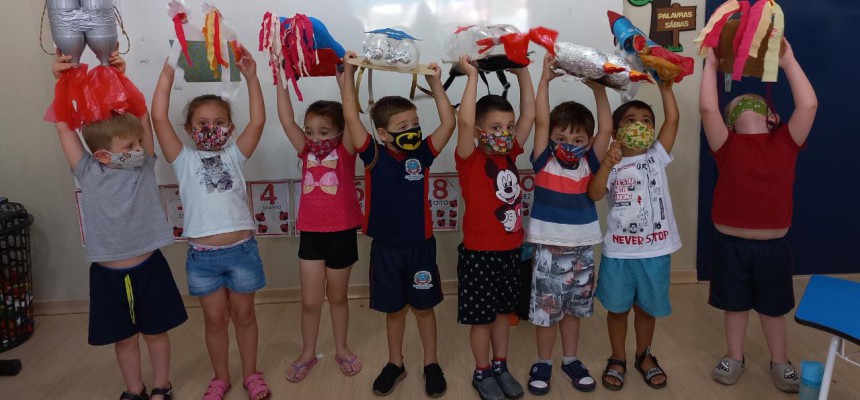 Aula sobre viagem espacial motiva pequenos estudantes na construção de foguetes de brinquedo.