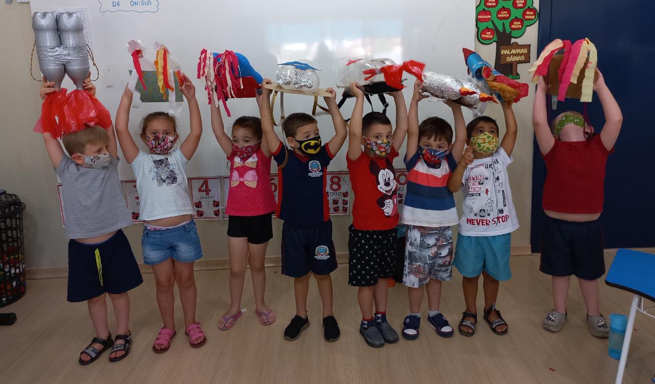Brincadeira de outro planeta aguçou a imaginação da criançada em aula de uma turminha do Maternal, no Centro de Educação Infantil Passinho Inicial, em Piratuba.