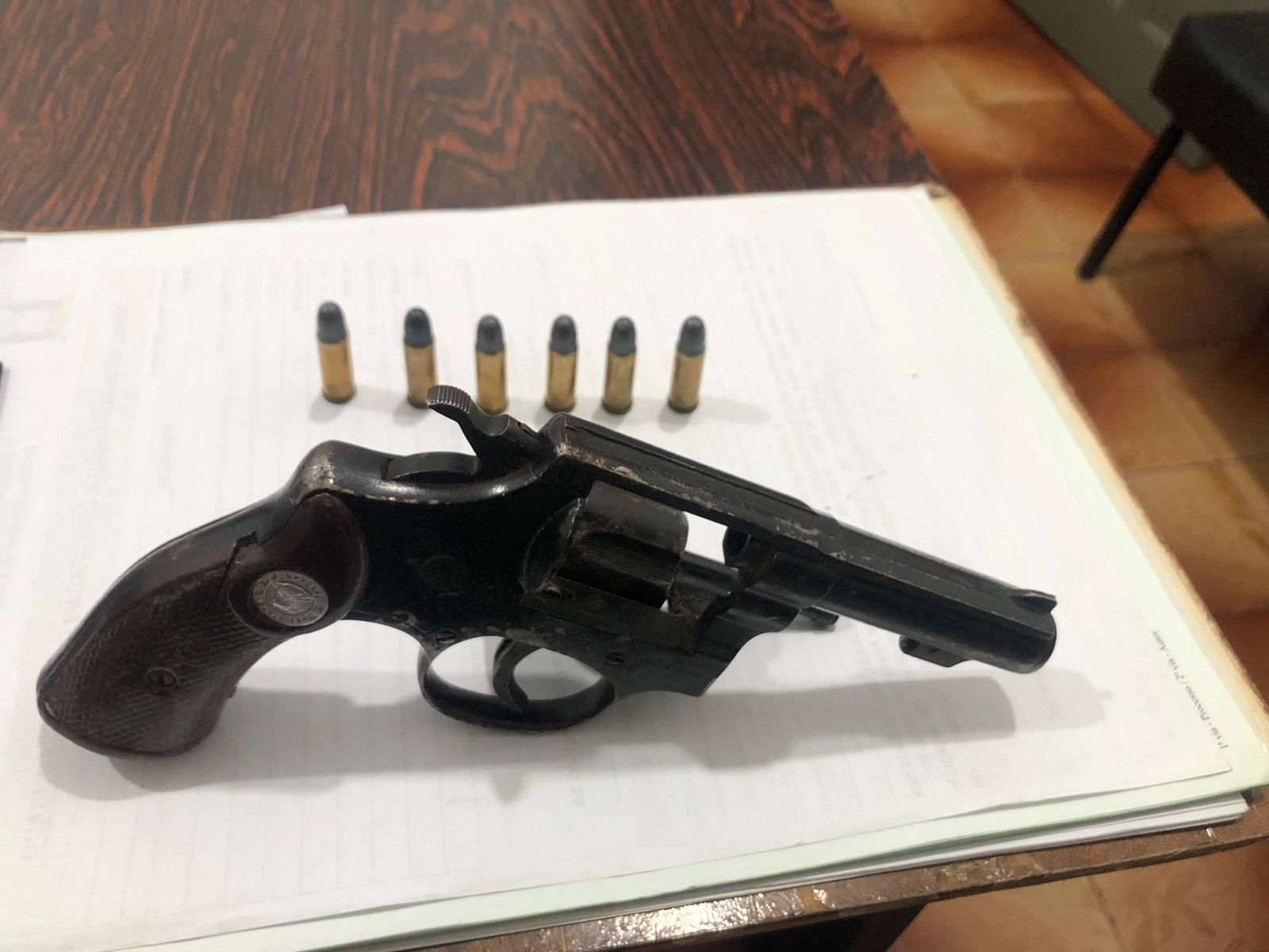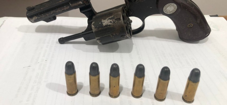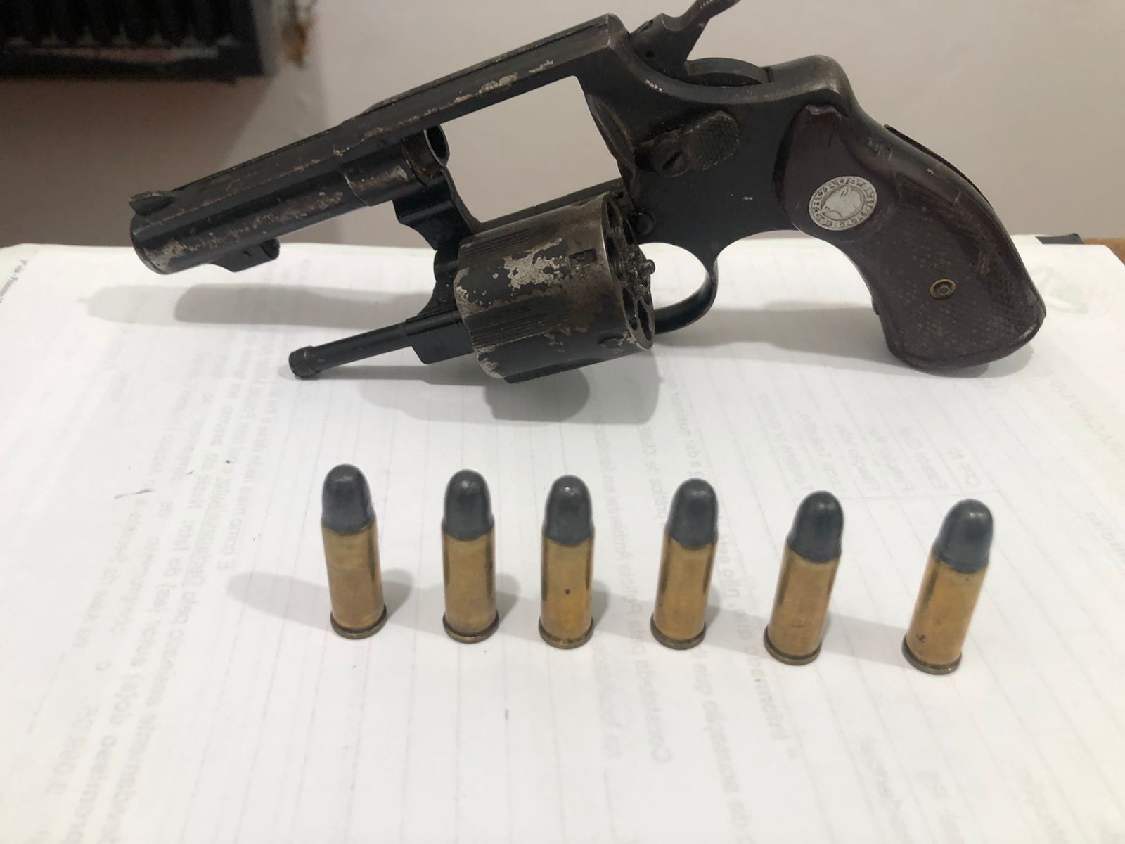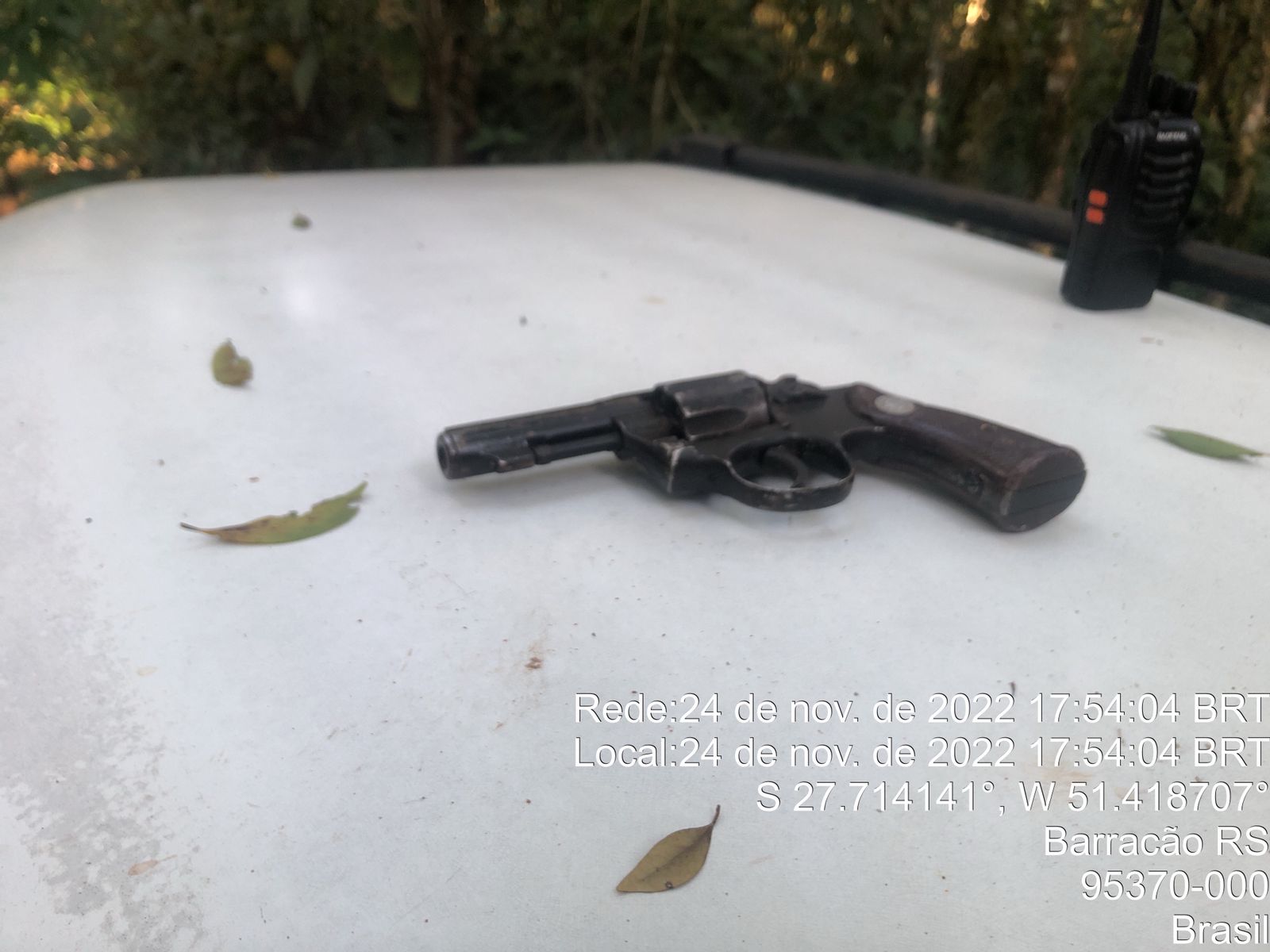 Chegando no local, foram encontrados dois indivíduos que estavam serrando madeira com uma serraria móvel, os mesmos foram abordados. Sendo realizado revista pessoal, não foi encontrado nada ilícito, ao realizar revista veicular, foi encontrado uma arma de fogo, revolver .32 municiado, com seis munições intactas.