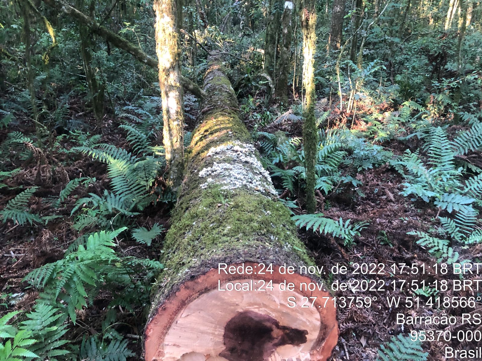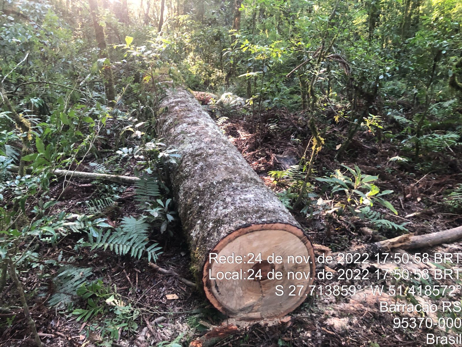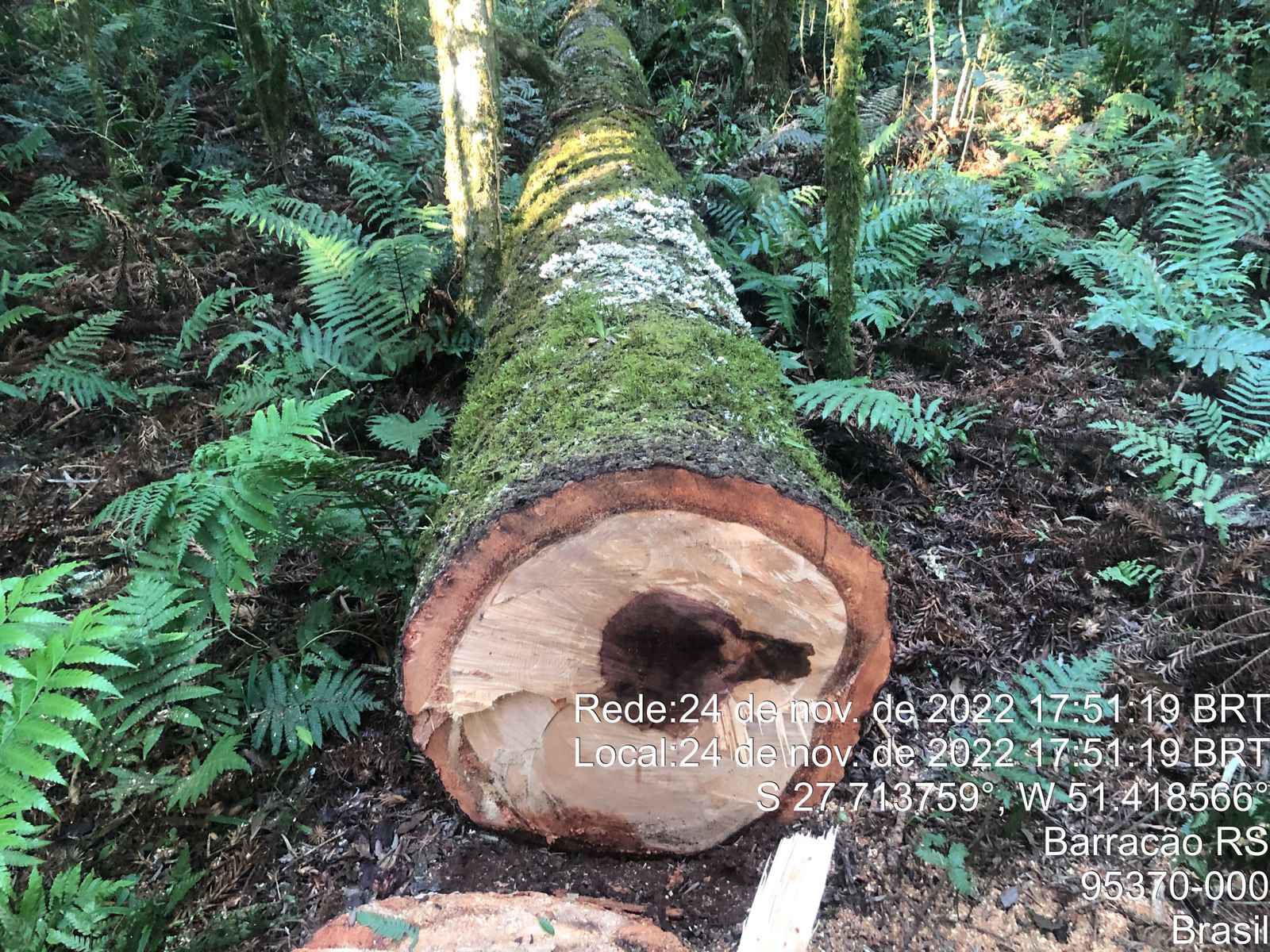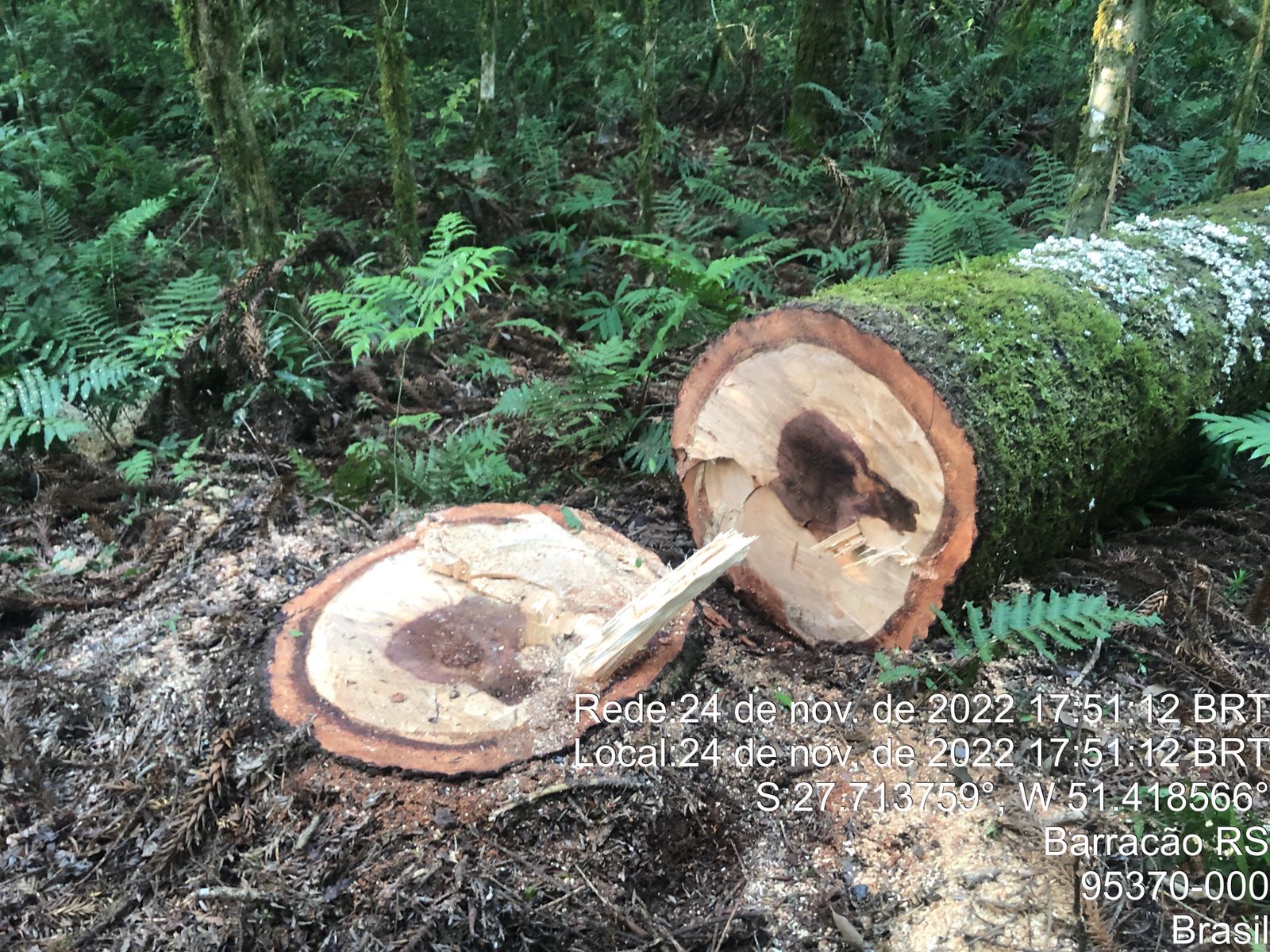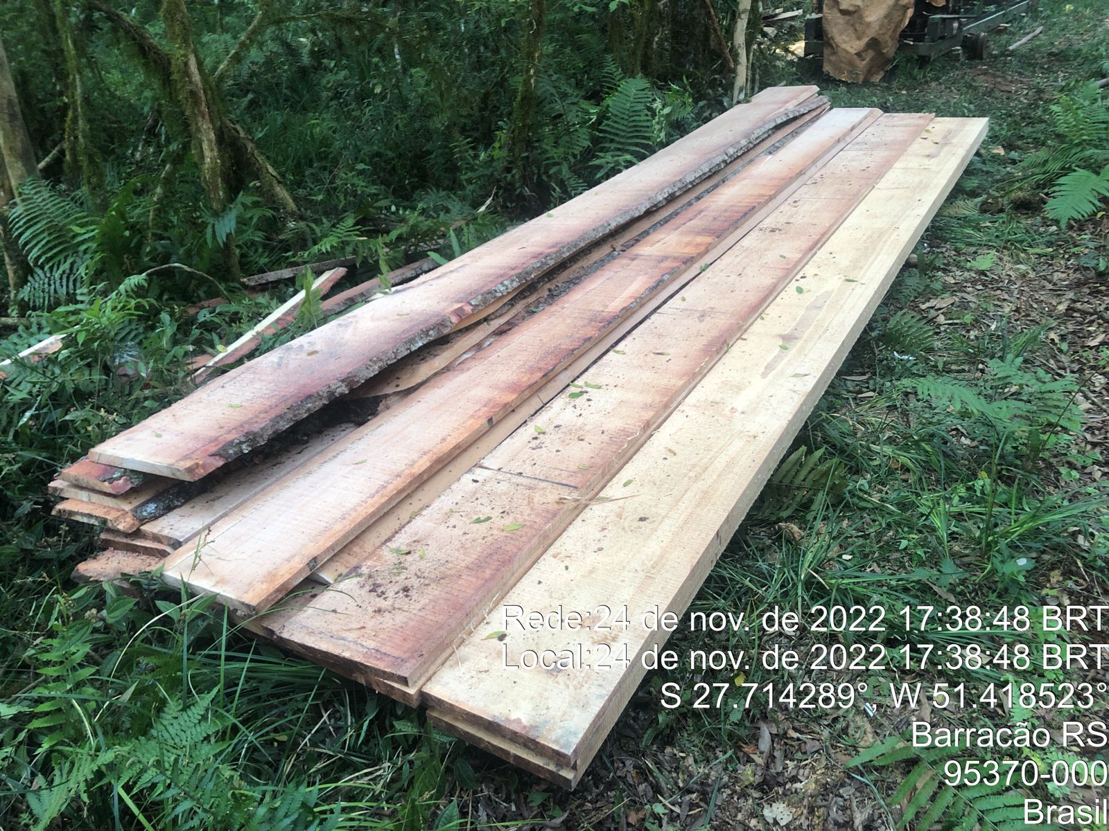Após, foi realizado vistoria no local, onde foi constatado o corte de 2 (duas) Araucárias Angustifólias Nativas, no meio da mata, as quais, estavam em toras, sendo encontrado 4 toras. Outra tora, já estava sendo serrada na serra móvel, onde haviam 19 tábuas de araucária, medindo 30 centímetros de largura, por 5,5 metros de comprimento, depositadas ao lado da serra.