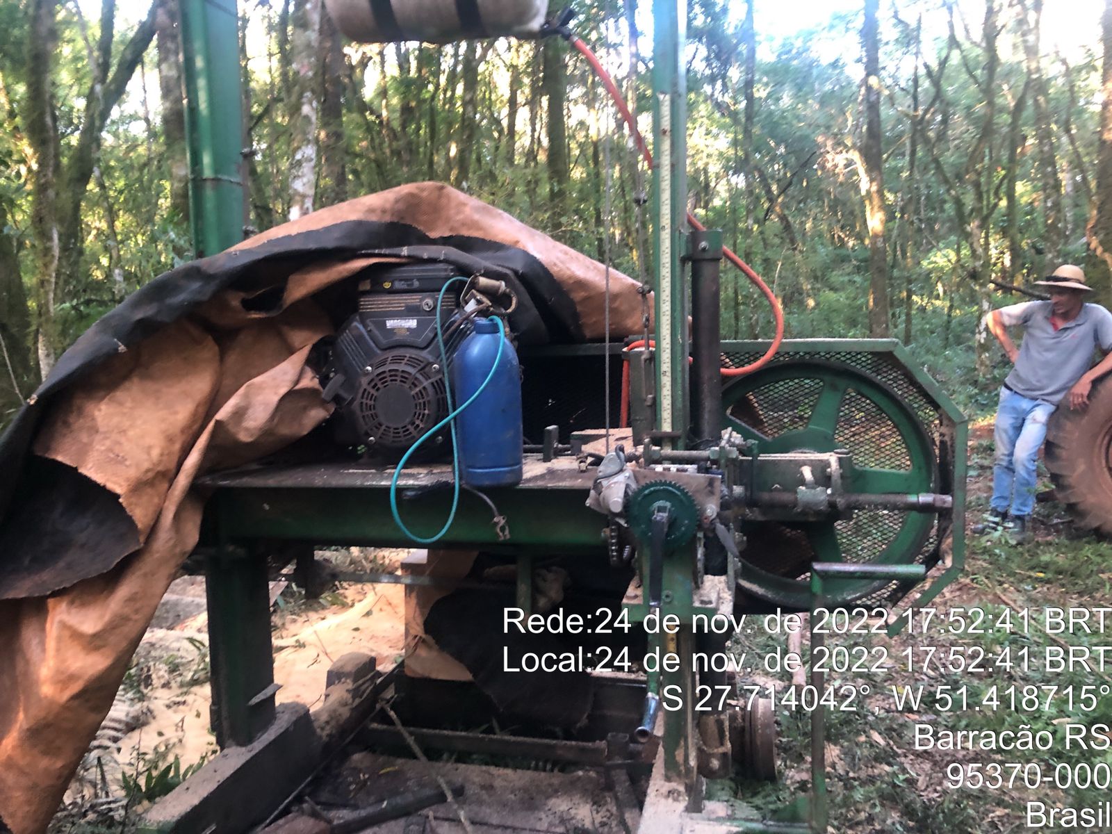 Foi lavrado também termo de Apreensão onde foram apreendidos uma serraria móvel, duas motosserras, 4 toras de araucária e 19 tábuas de araucária angustifólia.