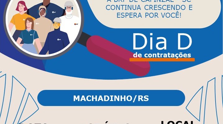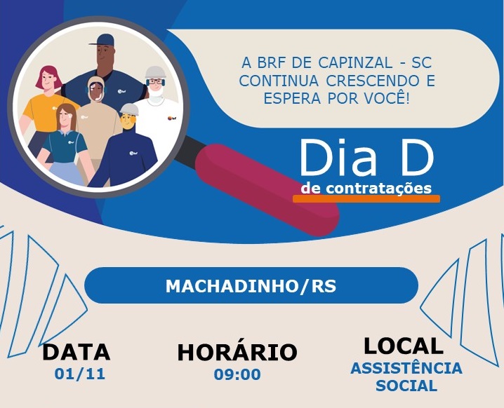 A BRF Capinzal, estará em Machadinho, nesta quarta-feira, dia 01 de novembro e irá realizar o “Dia D – de contratações”. Será, a partir das 09h00m, na Assistência Social.