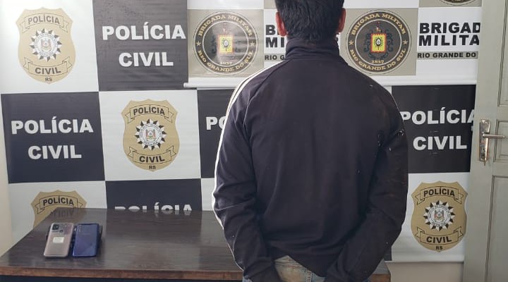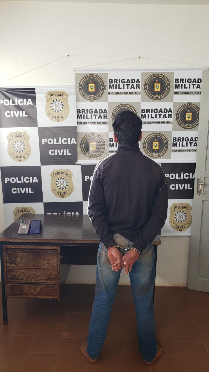 Um dos homens, maior de idade, foi localizado no interior do município, na beira de uma estrada do interior, sentido Paim Filho. Ao ser abordado, esboçou reação, sendo algemado pelos policiais. Ao ser revistado, foi encontrado sob a roupa, um aparelho de telefone celular marca MOTOROLA MOTO G 30, de cor lilás. Em seguida foi dado voz de prisão para o homem, que foi conduzido ao hospital local, para exame de lesões e posteriormente para a Delegacia de Polícia.
