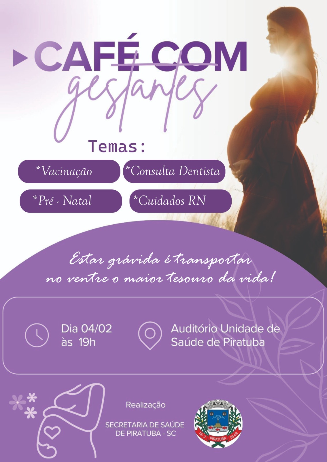 Na próxima terça-feira, dia 4 de fevereiro, a Secretaria de Saúde de Piratuba realizará o evento Café com Gestantes. O encontro ocorrerá às 19h, no auditório da unidade de saúde do município, e terá como foco principal a orientação às futuras mamães e papais sobre temas essenciais para o período da gestação e os primeiros cuidados com o bebê.