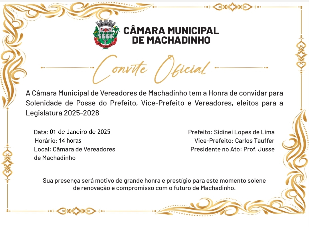 A Câmara Municipal de Machadinho, conforme Lei Orgânica do Município, lançou oficialmente o convite para a solenidade de posse do prefeito, vice-prefeito e vereadores, eleitos para a Legislatura 2025-2028. O evento acontecerá no dia 1 de janeiro de 2025, às 14 horas, no plenário da Câmara de Vereadores de Machadinho.