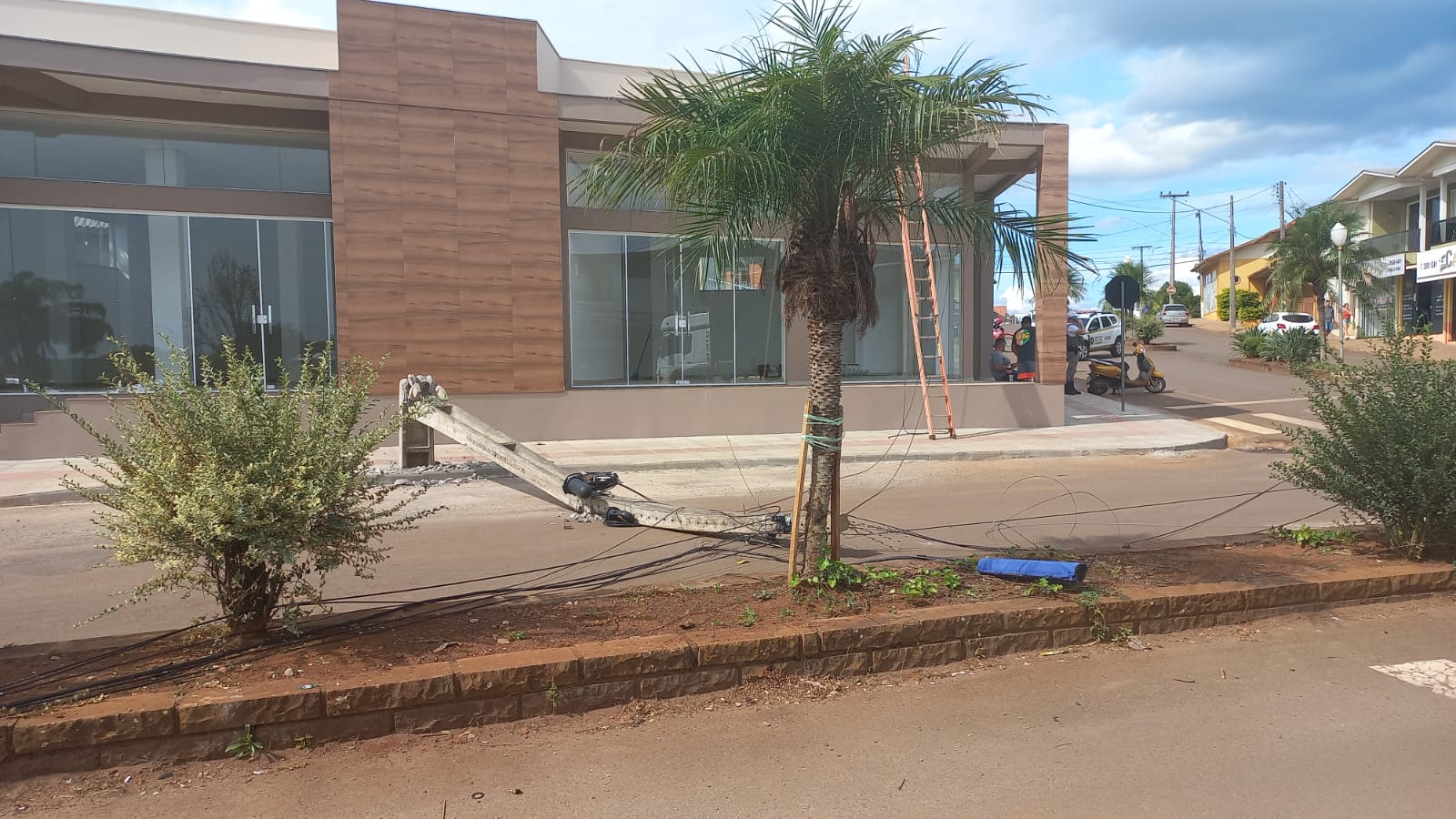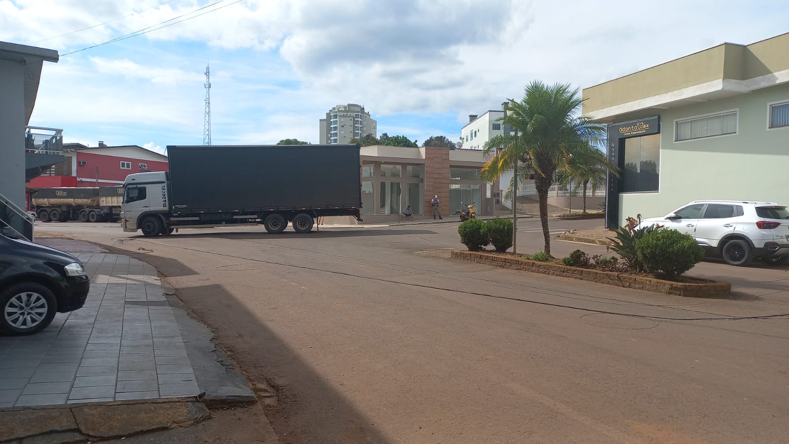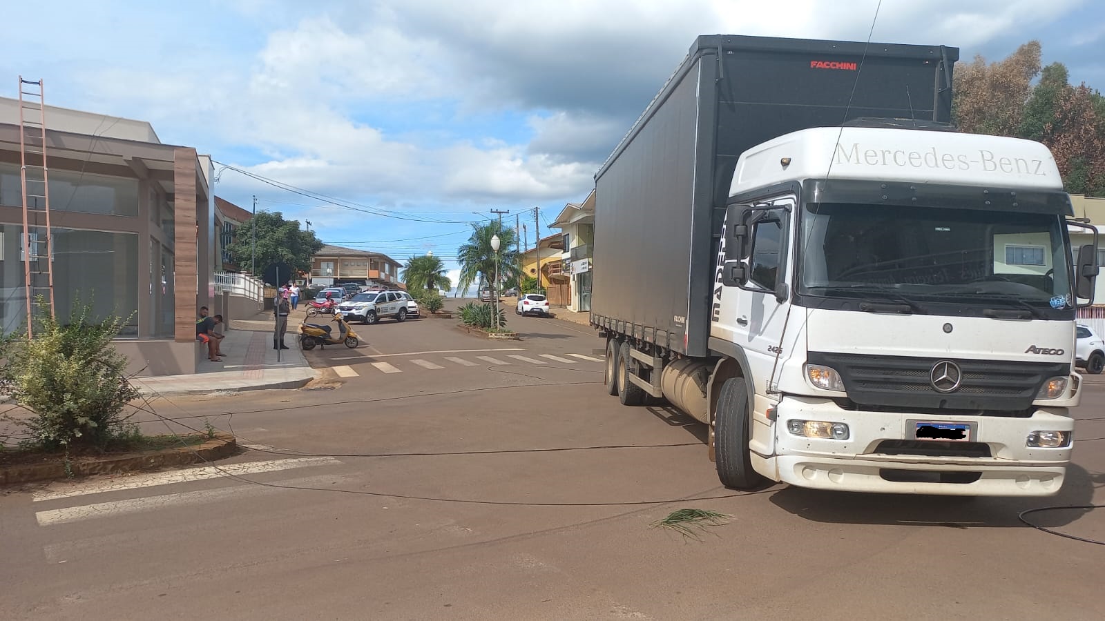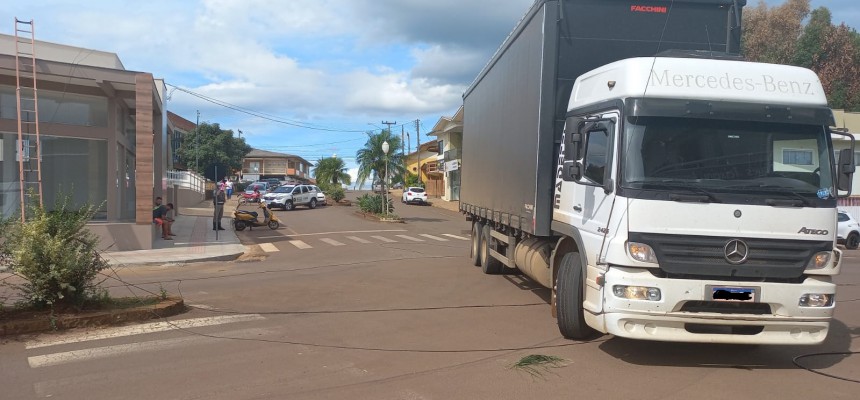 Um caminhão, Mercedes Benz – Atego (foto), por volta das 15h00m, da quarta-feira, 15 de março, transitava descendo a Rua João José Meassi (ao lado da Prefeitura), para entrar na Avenida Júlio de Castilhos, quando enroscou em fios de internet/telefonia e acabou derrubando um poste.