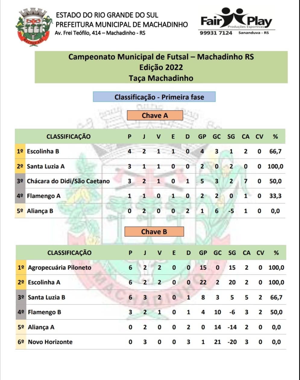 Chave B: Em primeiro, Agropecuária Piloneto, com seis pontos. Em segundo, Escolinha A, com seis pontos. Em terceiro, Santa Luzia B, com seis pontos. Em quarto, Flamengo B, com três pontos. Em quinto, Aliança A, com nenhum ponto e em sexto, Novo Horizonte, também com nenhum ponto.