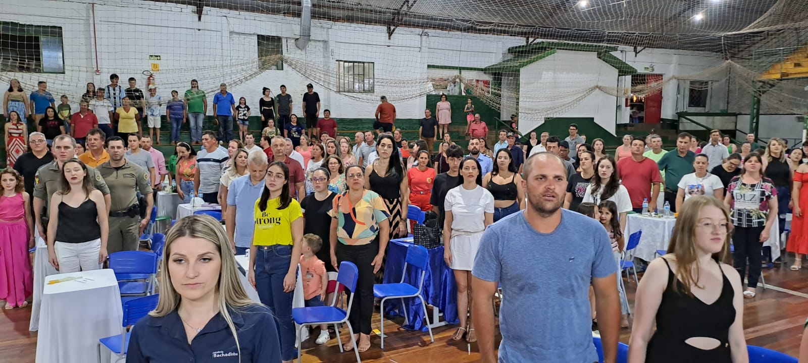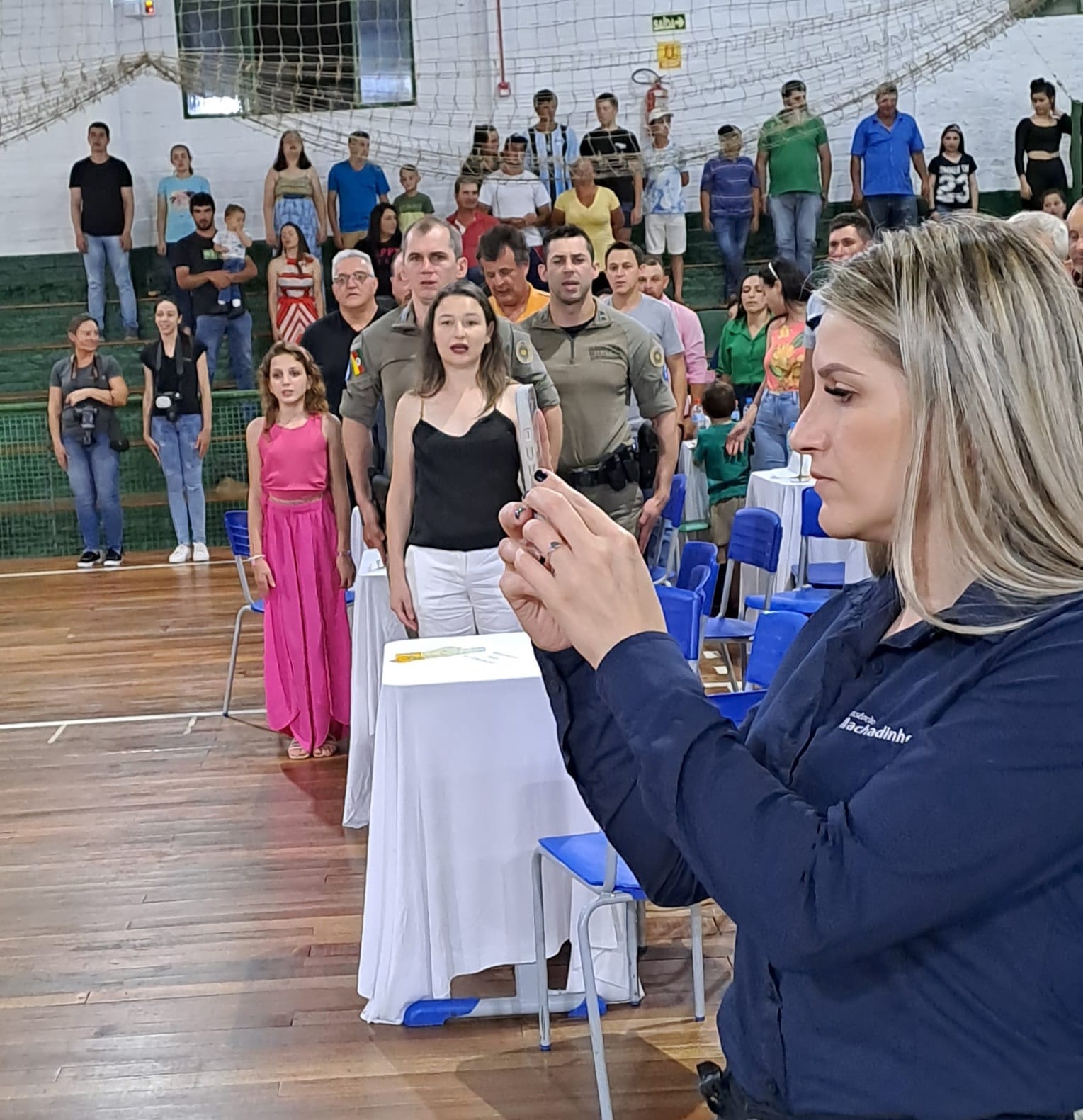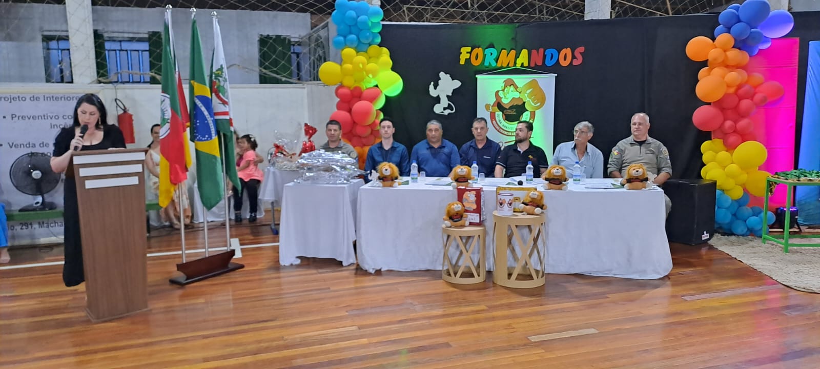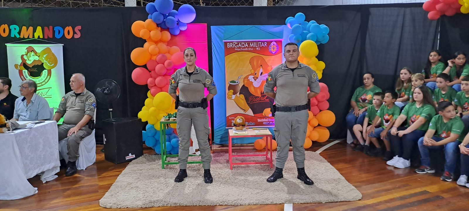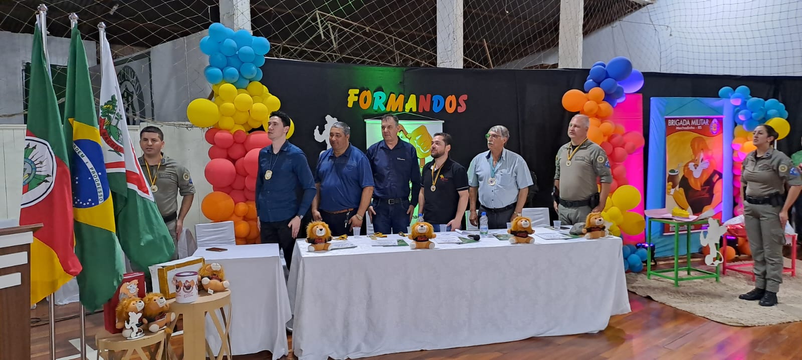 Na noite de quarta-feira, 13 de dezembro, o ginásio do Clube União, em Machadinho-RS, testemunhou a solene formatura do PROERD 2023. O evento contou com a presença de autoridades policiais e municipais, incluindo o Tenente-coronel Becker, comandante do 10º BPM (Vacaria), instrutores, familiares, formandos e a comunidade local.