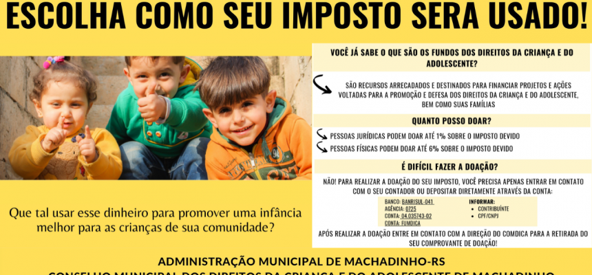 Com o intuito de obter fundos para serem aplicados, segundo determina a Lei Municipal n.º 2.733/15, de 22.94.2015, em tudo o que for necessário para suportar as despesas dos programas que visem a proteção, a preservação e as garantias dos direitos das crianças e dos adolescentes, de Machadinho (RS), o Conselho Municipal dos Direitos da Criança e do Adolescente – COMDICA, lançou, no dia 28 de fevereiro, a Campanha de Arrecadação de Recursos para o Fundo Municipal dos Direitos da Criança e do Adolescente – FUMDICA, através da doação espontânea de qualquer valor monetário, em qualquer dia do ano, ou através da doação de parte de seu imposto devido, quando da Declaração do Imposto de Renda.