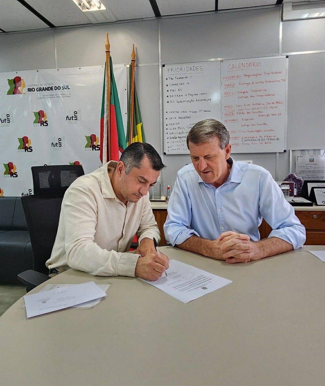 O Prefeito de Machadinho-RS, Sidinei Lopes de Lima, esteve em Porto Alegre na manhã da quarta-feira, 10 de dezembro de 2025, onde foi recebido no gabinete do Secretário do Trabalho e Desenvolvimento Profissional do Rio Grande do Sul, Gilmar Sossella. Na ocasião, o prefeito assinou um importante convênio que garantirá ao município recursos do Governo do Estado destinados à oferta de Cursos Profissionalizantes para municípios habilitados.
