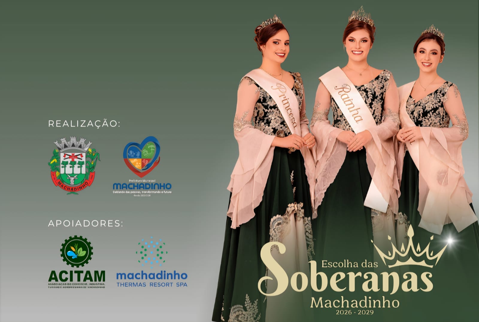 A Administração Municipal de Machadinho informa que estão abertas as inscrições para o Concurso das Soberanas do Município, um evento tradicional que tem como objetivo valorizar, homenagear e destacar a mulher machadinhense, além de eleger a Rainha e duas Princesas que irão representar oficialmente o município.