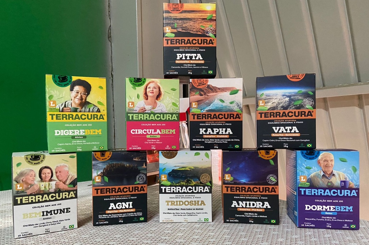 Agora para somar, chegaram os lançamentos: CHÁ BRANCO e a linha TERRACURA. A linha Terracura é bem grande, com chás para idosos, adultos, crianças e “pets”.