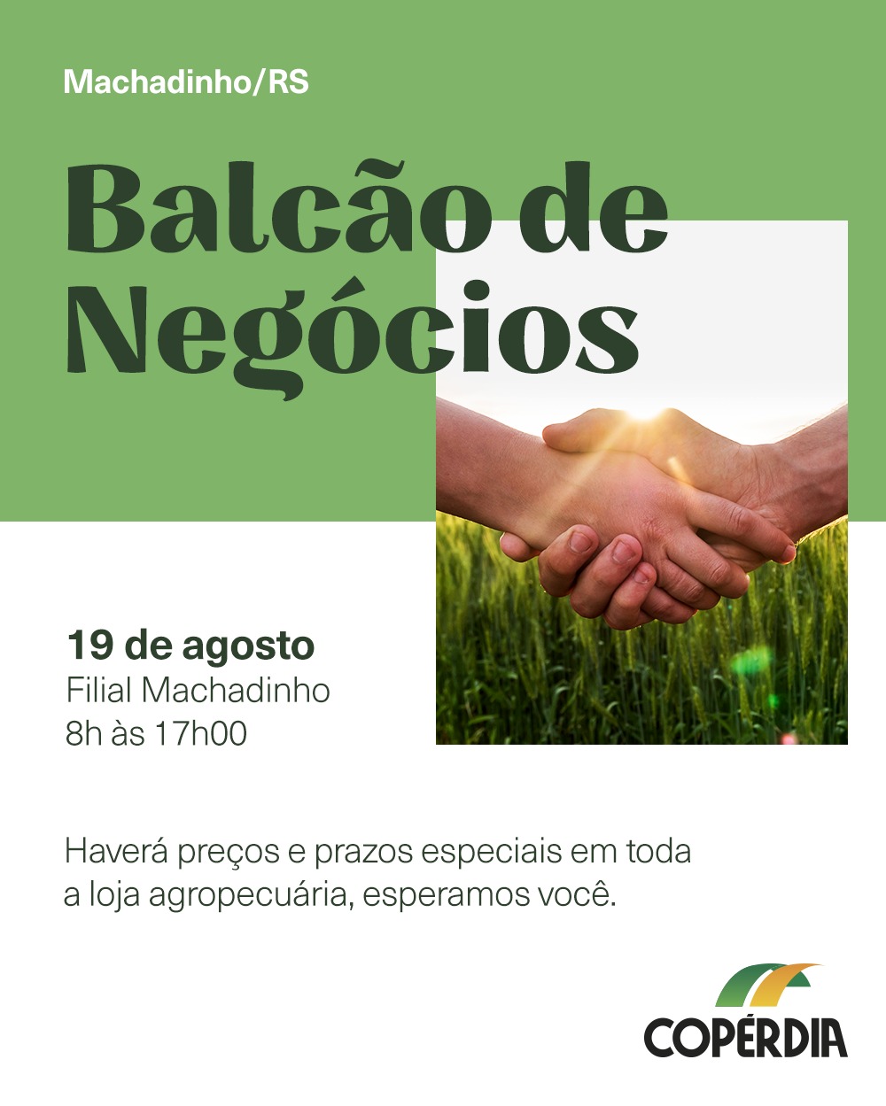 Em mais uma oportunidade de ótimos negócios, a Copérdia, loja agropecuária de Machadinho, irá proporcionar aos seus clientes e associados, um dia especial com preços e prazos “realmente” diferenciados.