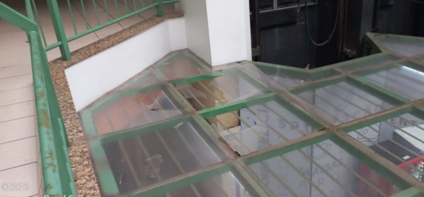 Com o impacto da queda, a estrutura quebrou e ela caiu no piso do mercado.
