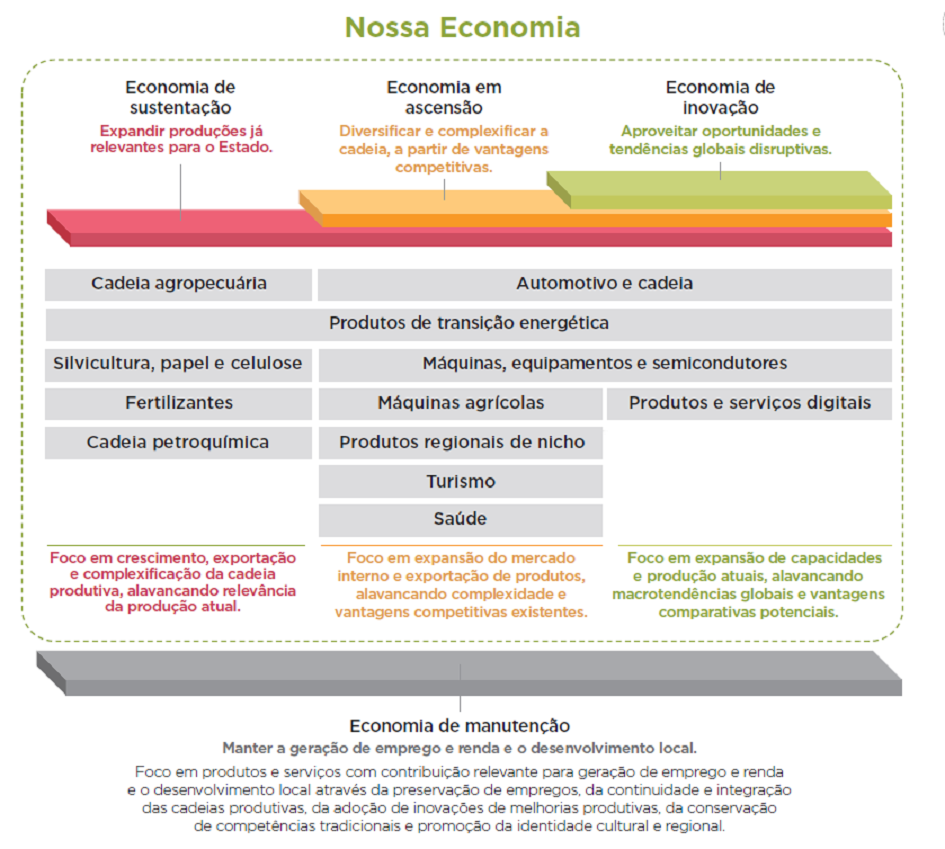 A partir das análises e projeções realizadas, foram identificados 12 setores nos quais o Rio Grande do Sul é competitivo e há demanda crescente. Em cada um dos grupos, foram destacados produtos e serviços mais complexos e inovadores que reúnem grande chance de avanços. Diversos segmentos apresentam oportunidades promissoras e foram classificados em quatro perspectivas de economia com suas estratégias de desenvolvimento.