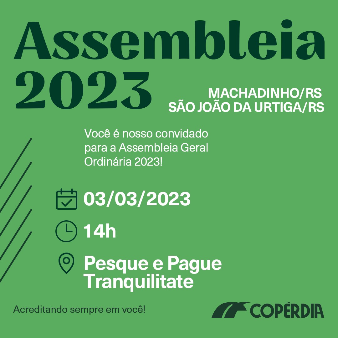A direção da Copérdia, está realizando uma série de Assembleias Gerais Ordinárias para prestação de contas do exercício de 2022, apresentação do planejamento estratégico para 2023 e anos futuros, renovação de dois terços do conselho fiscal e eleição do Conselho de Administração para o quadriênio 2023/2026. A maratona de encontros, começou por Ipumirim, no dia 27 de janeiro e nesta sexta-feira, 03 de março de 2023, acontecerá em Machadinho. Esta reunião, será para os associados de Machadinho, São João da Urtiga, Maximiliano de Almeida, Paim Filho e Cacique Doble e será realizada, nas dependências do Pesque Pague e Bosque Tranquilitate. Ao todo estão acontecendo, 46 encontros, em todas as unidades.