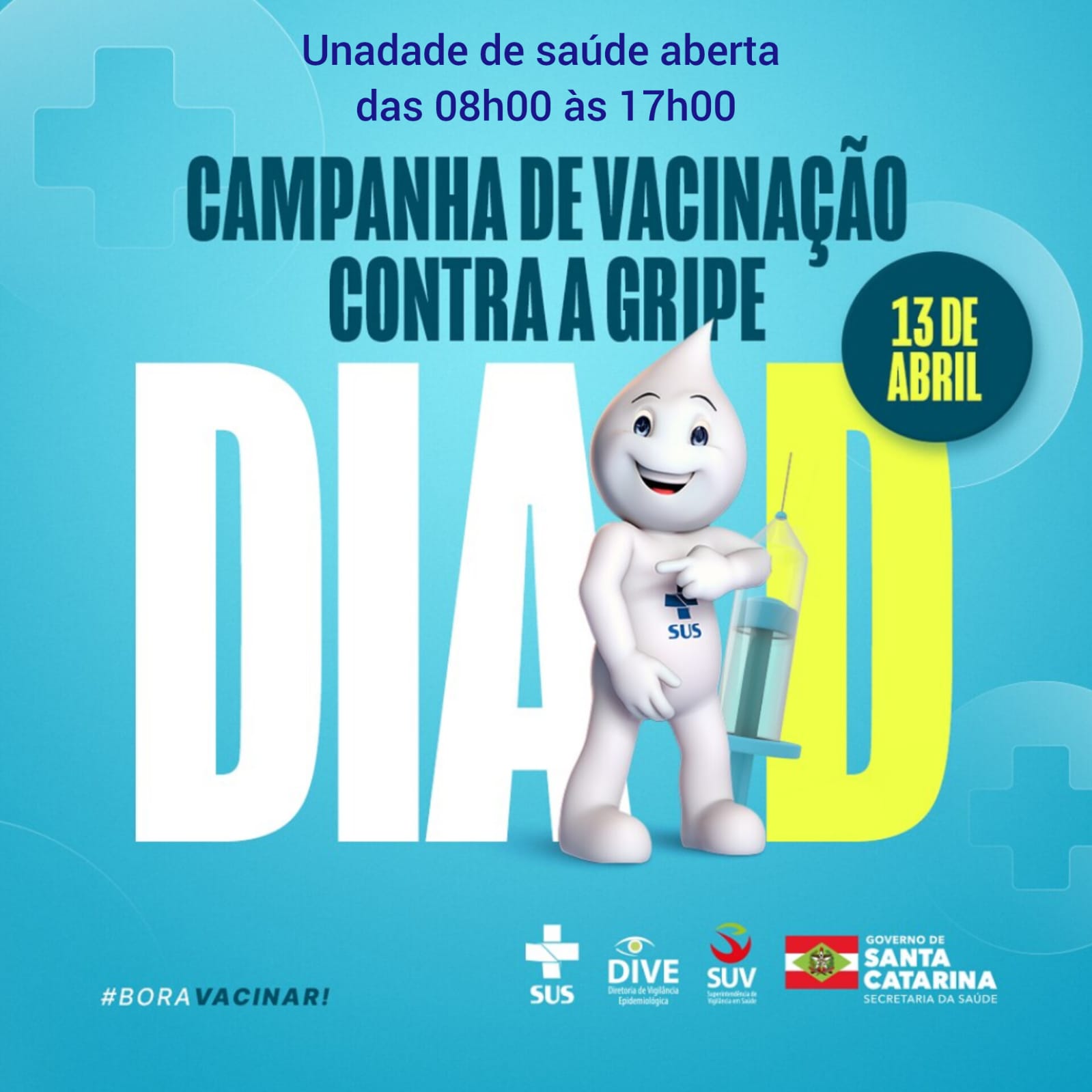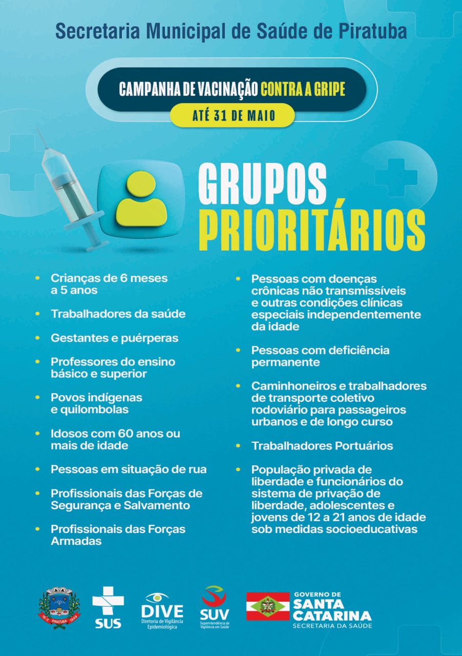 Dia 13 de abril (sábado) acontecerá o dia D da Campanha de Vacinação Contra a Influenza e a IV Mobilização Estadual contra o tétano, com atendimento em horário especial, das 8h às 17h. A Campanha se estende até dia 31 de maio e ocorrerá na Unidade Básica de Saúde de Piratuba.