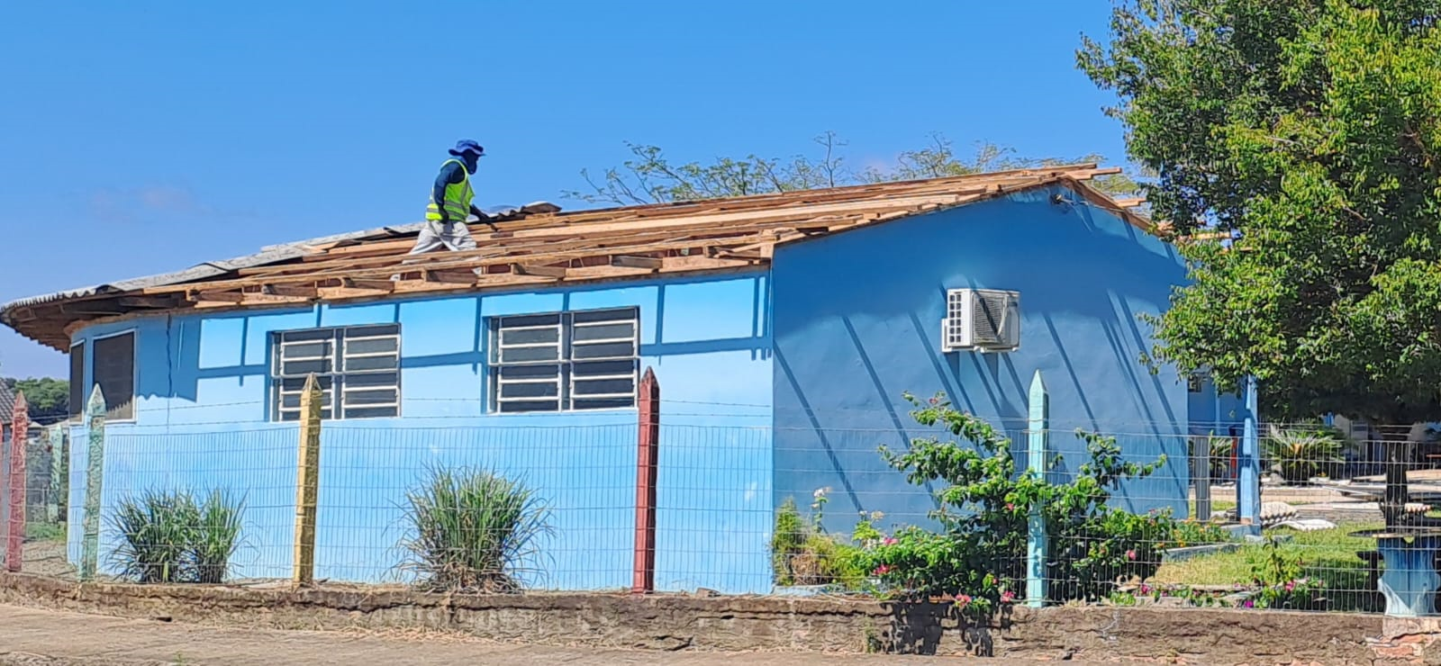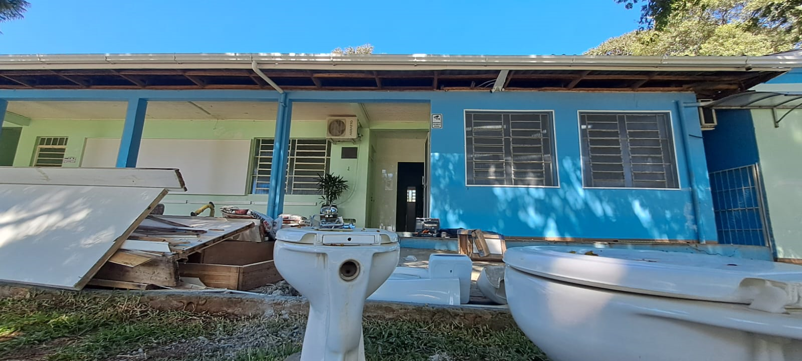 Na Escola ITACYR FONTANA: Troca de aproximadamente 750 m² de telhamento da cobertura, troca de abas e calhas. Valor R$ 89.500,00. Execução: Empresa DLX.