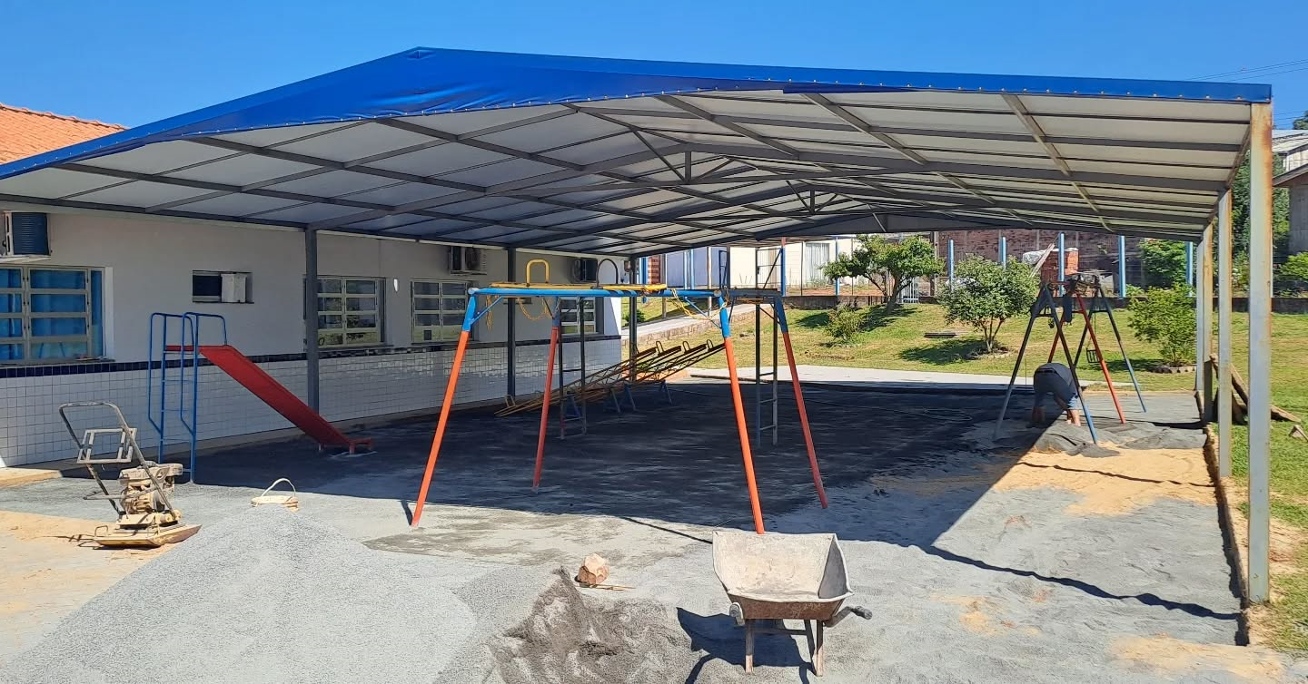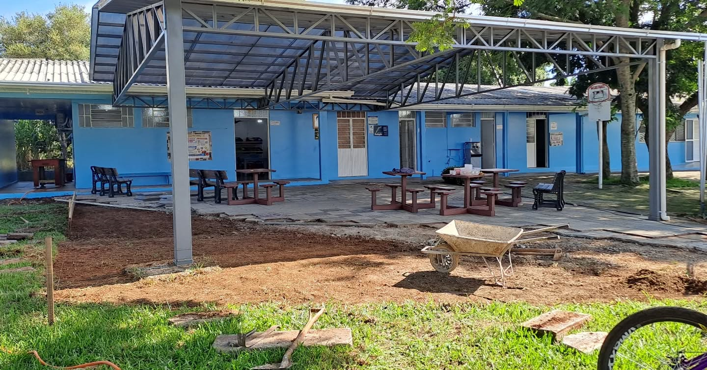 Na Escola MURIAM PIOVEZAN DE LIMA: Está sendo construída uma quadra de Pickleball, instalação de revestimento cerâmico e lajotas de concreto nas calçadas externas da escola, além da reforma dos beirais. Valor de R$ 57.000,00. Execução, pela Empresa MC Confortin Engenharia.