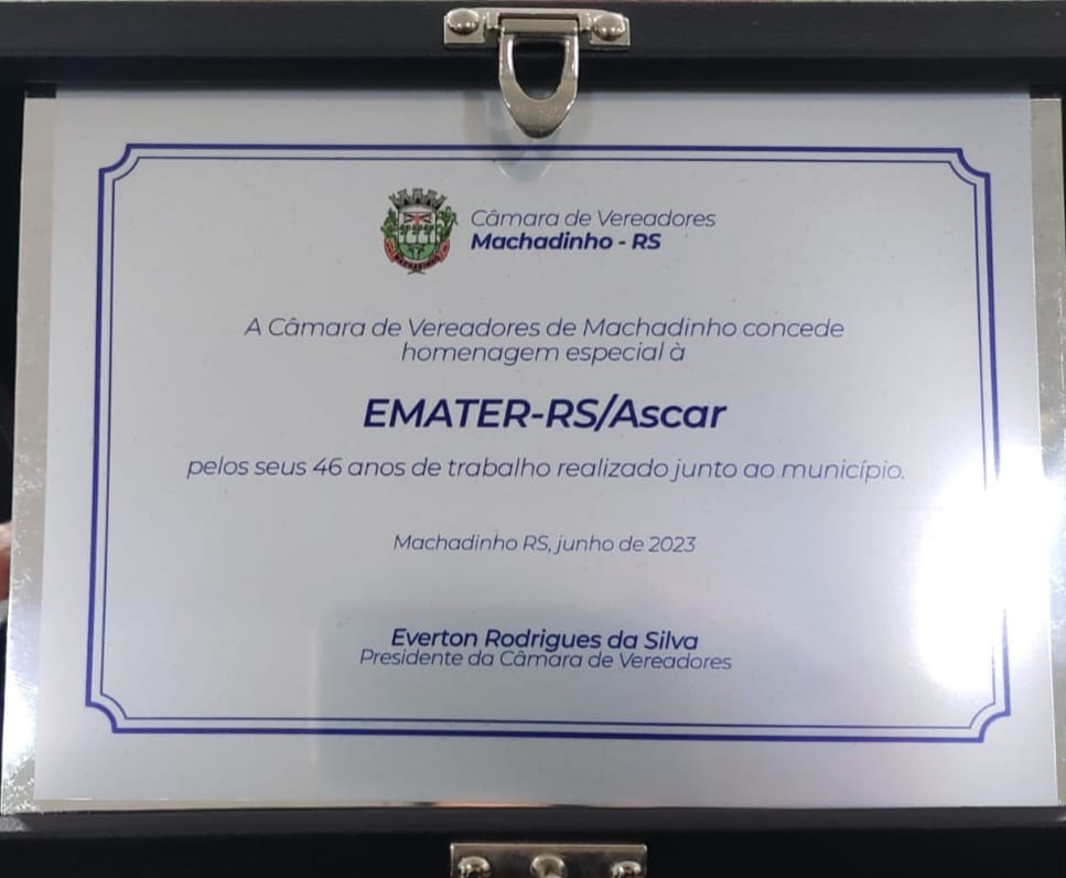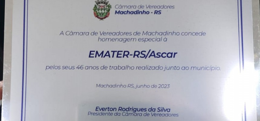 Os vereadores machadinhenses, em Sessão Ordinária, realizada no dia 27 de junho de 2023, através da Lei Municipal N° 3.415/2023, conferiram homenagem ao escritório da EMATER, de Machadinho. A importante homenagem, foi realizada em reconhecimento aos 46 anos de trabalhos realizados, junto à comunidade machadinhense.