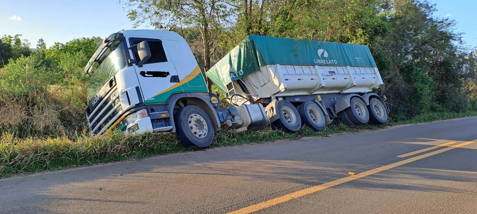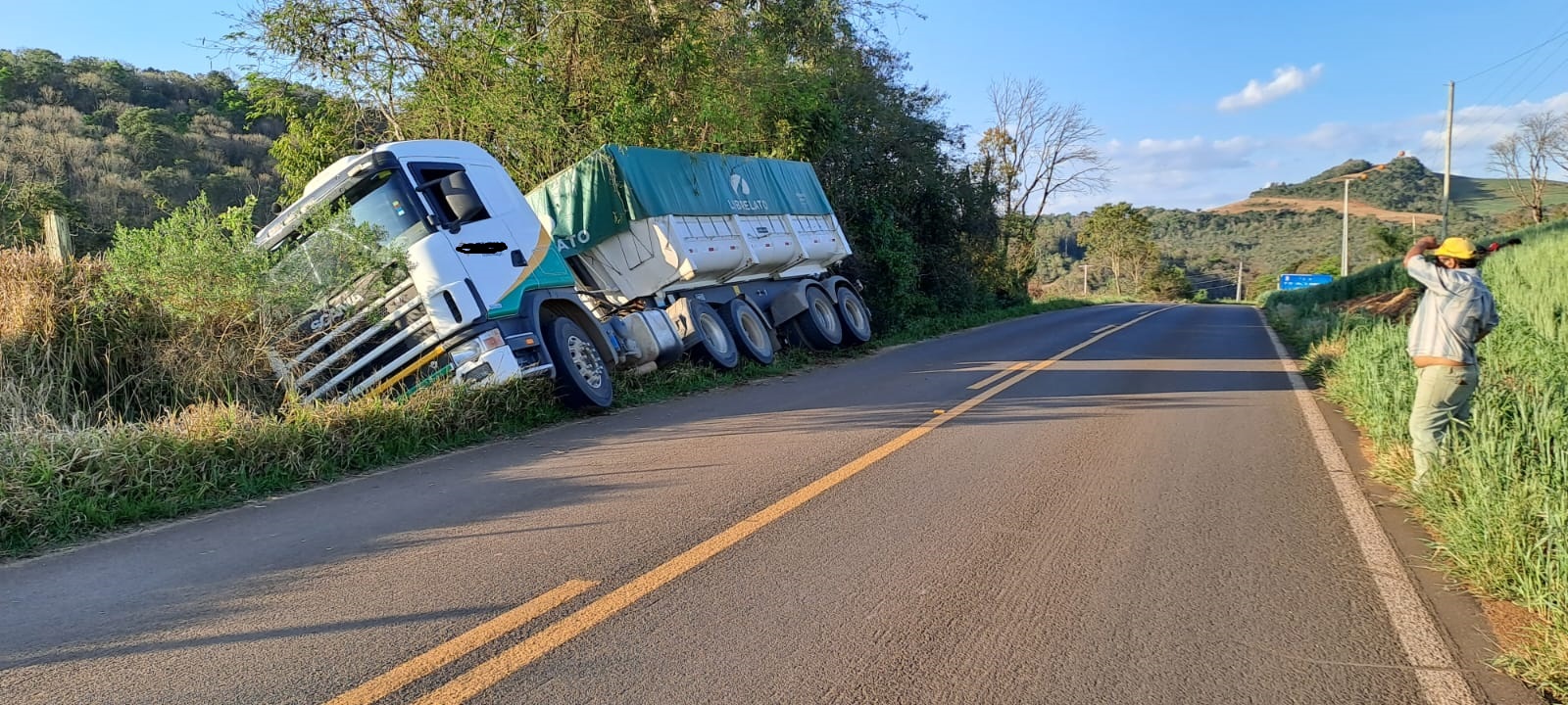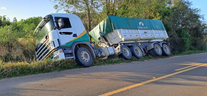 O fato ocorreu por volta das 17h00m, desta quinta-feira, 15 de setembro, quando o caminhão fazia o sentido Machadinho/Maximiliano e depois da ponte, acabou saindo fora da pista.