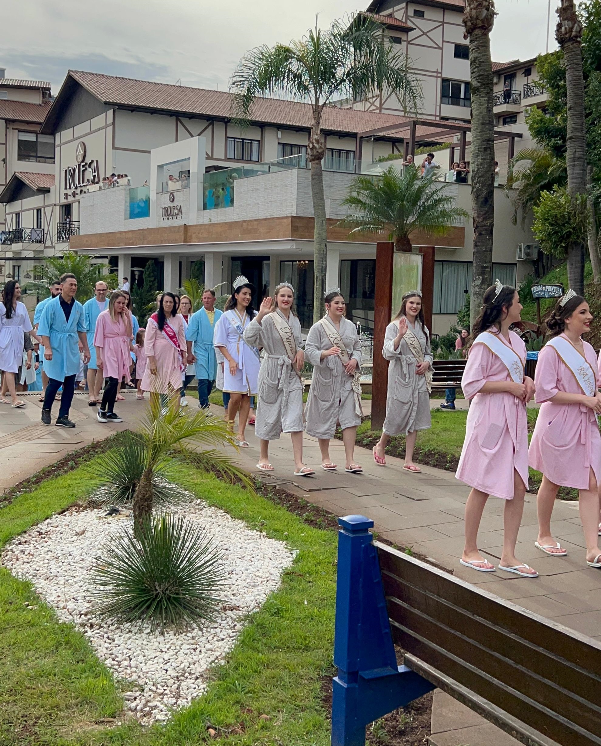 A programação começou com o desfile pela Avenida 18 de Fevereiro, reunindo participantes vestidos a caráter em roupões coloridos e criativos, chamando a atenção de quem acompanhava. O trajeto seguiu até o pátio das Termas, onde os presentes encontraram uma decoração impecável que transformou o espaço em um verdadeiro palco festivo.