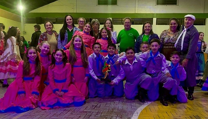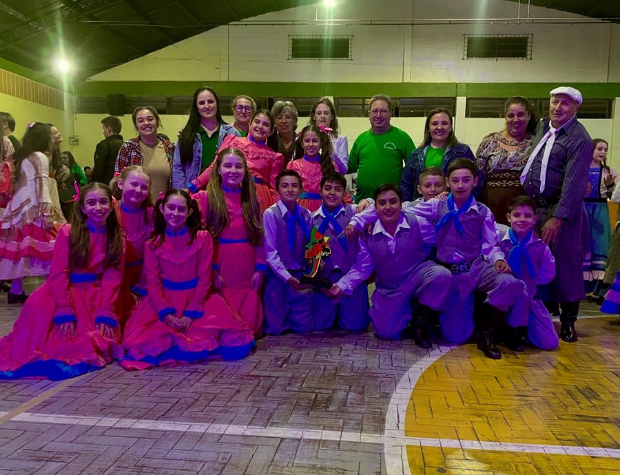 O grupo de danças folclóricas Gritos de Liberdade, de Machadinho, conquistou o 1º lugar na categoria Mirim durante a Mostra de Danças promovida pelo CTG Pegadas do Vale, no município de Carlos Gomes, realizada na noite de sábado, 5 de abril de 2025.