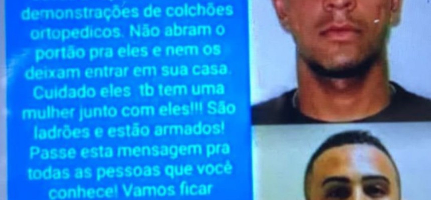 O post, diz que os dois, ainda estariam acompanhados por uma mulher e seriam ladrões se passando por vendedores, em uma Saveiro branca. Não repasse, e FAKE.