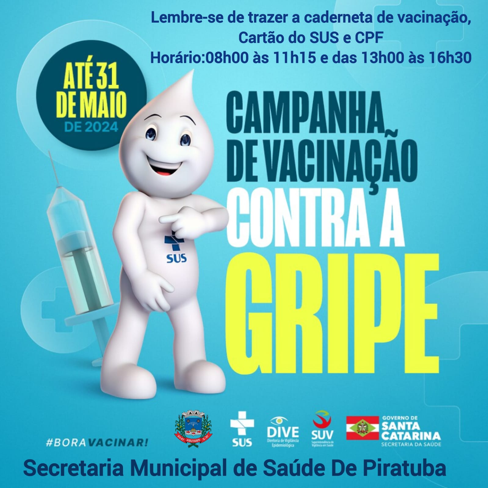 Inicia nessa segunda-feira dia 25 de março a Campanha de Vacinação Contra a Influenza e a IV Mobilização Estadual contra o tétano. A Campanha se estende até dia 31 de maio e ocorrerá na Unidade Básica de Saúde de Piratuba, o horário de atendimento será das 08h às 11h15 e das 13h às 16h30, e no dia 13 de abril (sábado) acontecerá o dia D com atendimento em horário especial, das 8h às 17h.