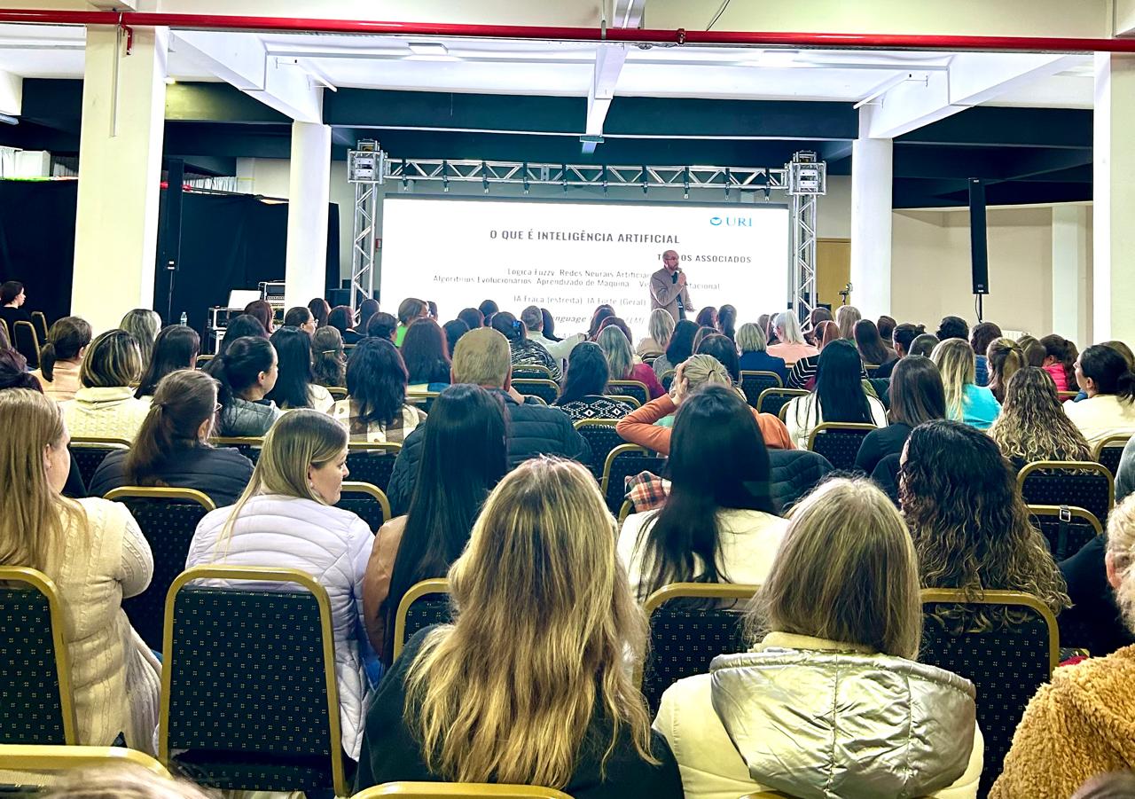 Na noite de 16 de junho, o Centro de Eventos do Machadinho Thermas Resort Spa foi palco de uma instigante palestra sobre um dos temas mais relevantes da atualidade: “Inteligência Artificial e seus impactos na sala de aula”, ministrada pelo Professor Doutor Cássio Baratieri, da Universidade Regional Integrada (URI) de Erechim. O encontro reuniu professores e profissionais da educação das redes municipal e estadual de ensino de Machadinho, bem como das Secretarias Municipais de Educação de Paim Filho e Maximiliano de Almeida, que, em parceria com a URI, participam de um curso de formação continuada promovido pela universidade.