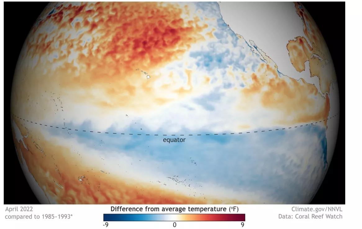 A La Niña voltou a ganhar força no outono e fazia muito tempo que o Pacífico não se encontrava tão frio na região equatorial nesta época do ano, de acordo com os dados da série histórica mantidos pela agência NOAA. Com -1,1°C, abril de 2022 empatou com 1950 para maior anomalia negativa de abril no Pacífico Central.