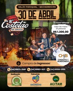 A comunidade de Machadinho e toda a região já pode se preparar para mais uma grande edição do tradicional Costelão na Brasa, um evento já consagrado, que acontece no dia 30 de abril, véspera do feriadão do Dia do Trabalhador.