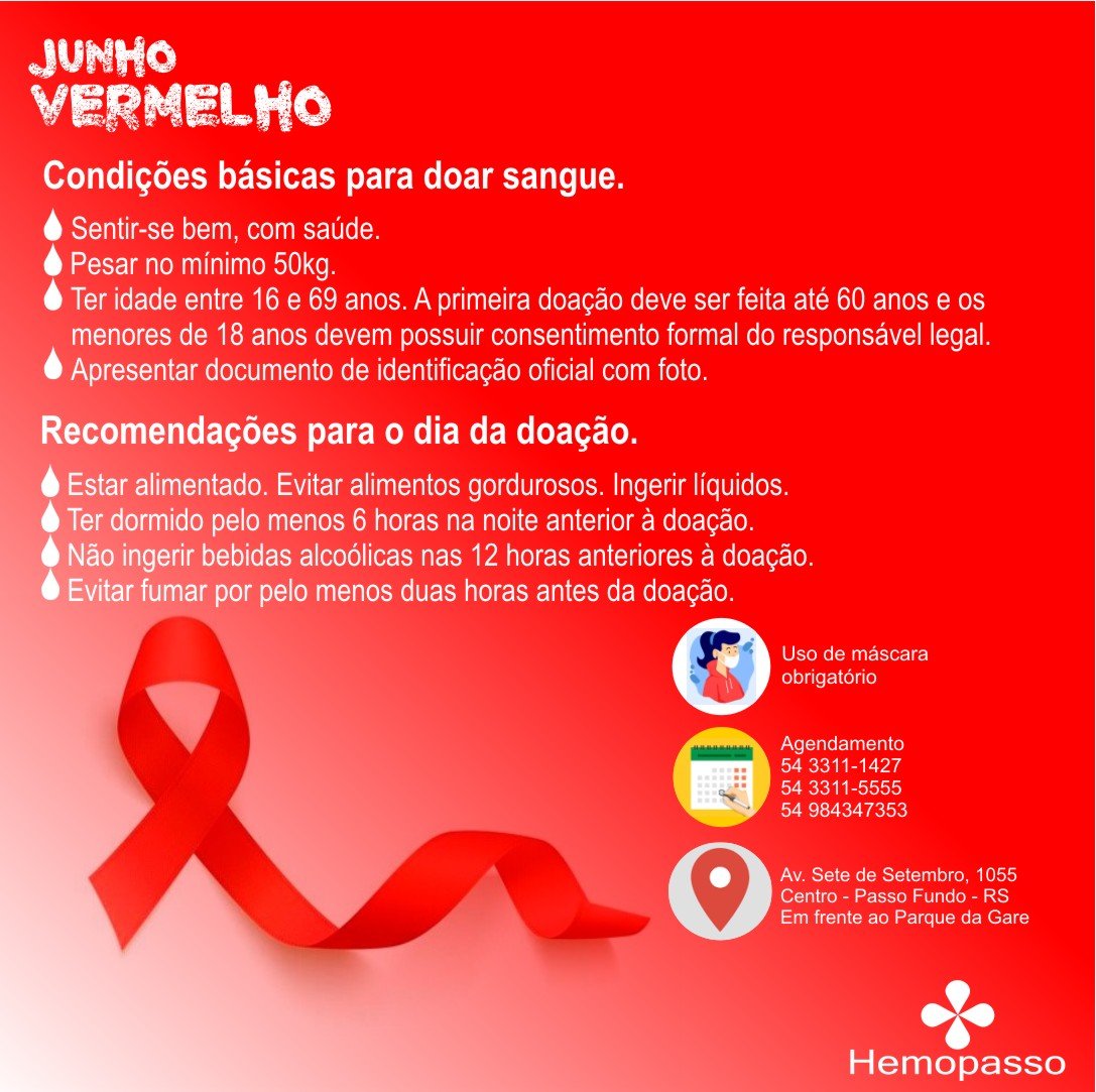 O dia Mundial do Doador de Sangue, é comemorado anualmente no dia 14 de junho. Por isso, o mês de junho foi destacado para conscientizar e incentivar a população sobre a importância de ser um doador. Segundo Alexandra Mazzoca, Coordenadora de Captação de Doadores, do Hemopasso de Passo Fundo, devido aos períodos de Outono e Inverno, épocas em que há um aumento das infecções respiratórias, as doações estão em baixa. Daí a necessidade do estimulo às doações permaneçam em todas as épocas do ano.