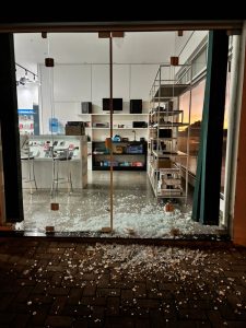 Um indivíduo quebrou a porta de vidro do estabelecimento utilizando uma barra de ferro, tipo alavanca, e entrou rapidamente no local.