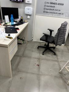 O homem usava roupas escuras, casaco preto com capuz e boné, dificultando sua identificação pelas câmeras de segurança. Pingos de sangue no chão, indicam que o meliante se feriu na ação.