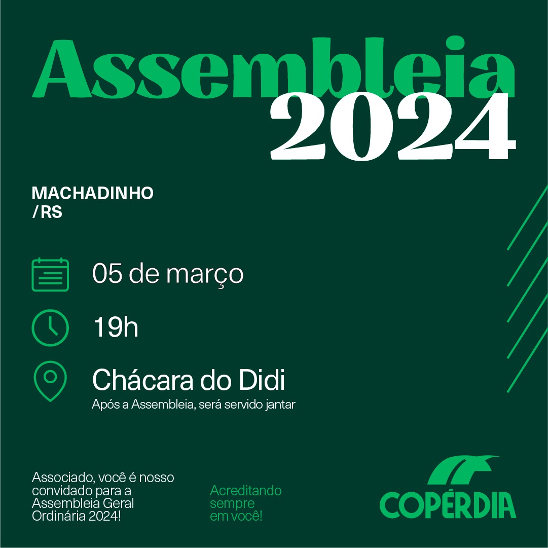 Dia 05 de março de 2023, acontece em Machadinho-RS, a Assembleia Geral Ordinária de 2024, da Copérdia. O objetivo é a prestação de contas do exercício de 2023, com os números e os planejamentos para 2024, disponibilizar as sobras líquidas, além de tratar de assuntos gerais da organização.