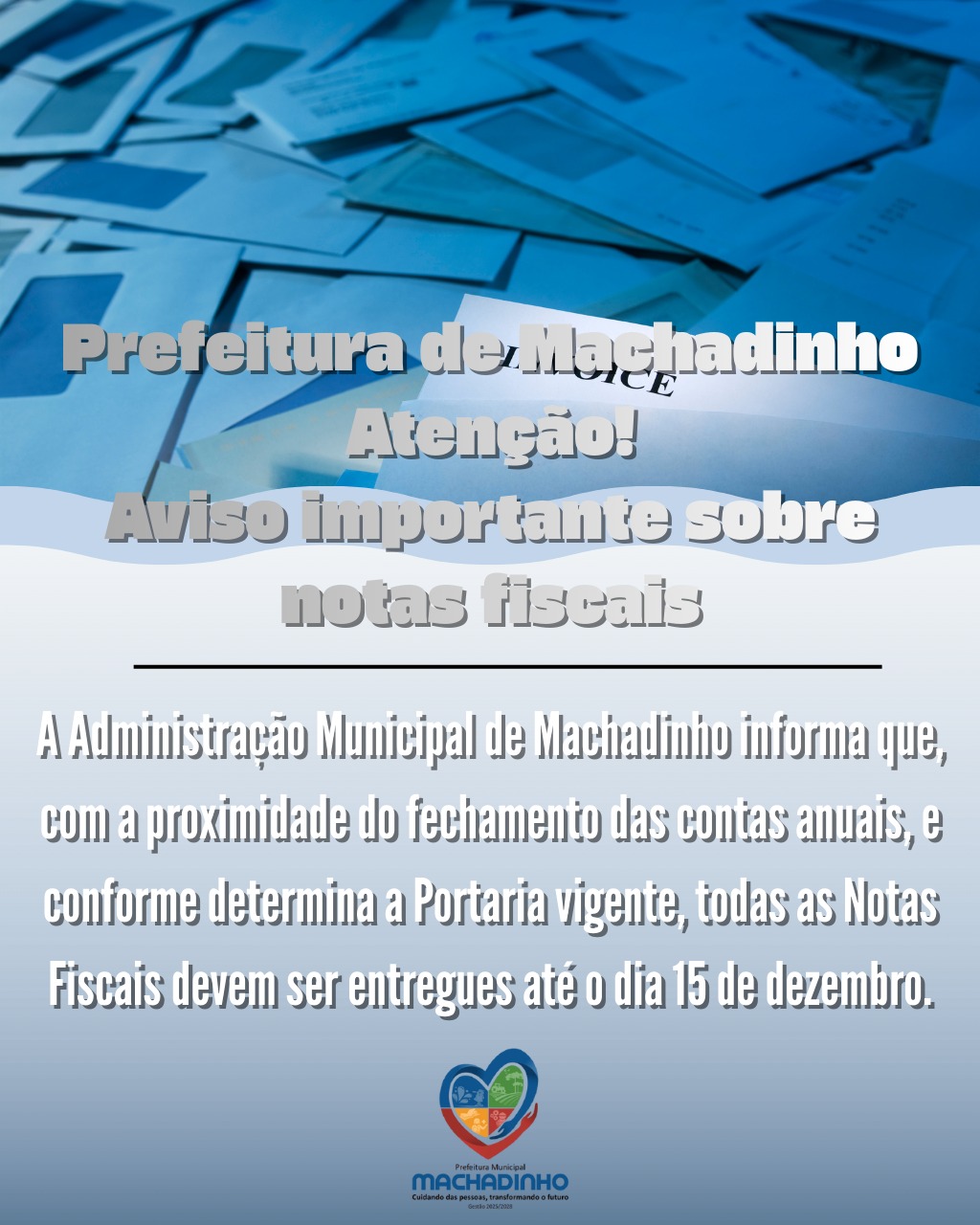 A Administração Municipal de Machadinho informa que, com a proximidade do fechamento das contas anuais, todas as Notas Fiscais devem ser entregues até o dia 15 de dezembro.