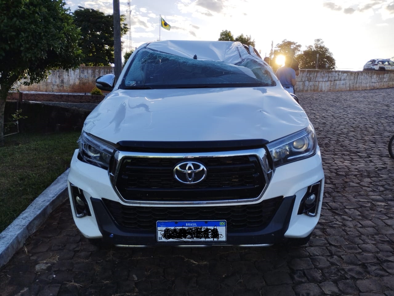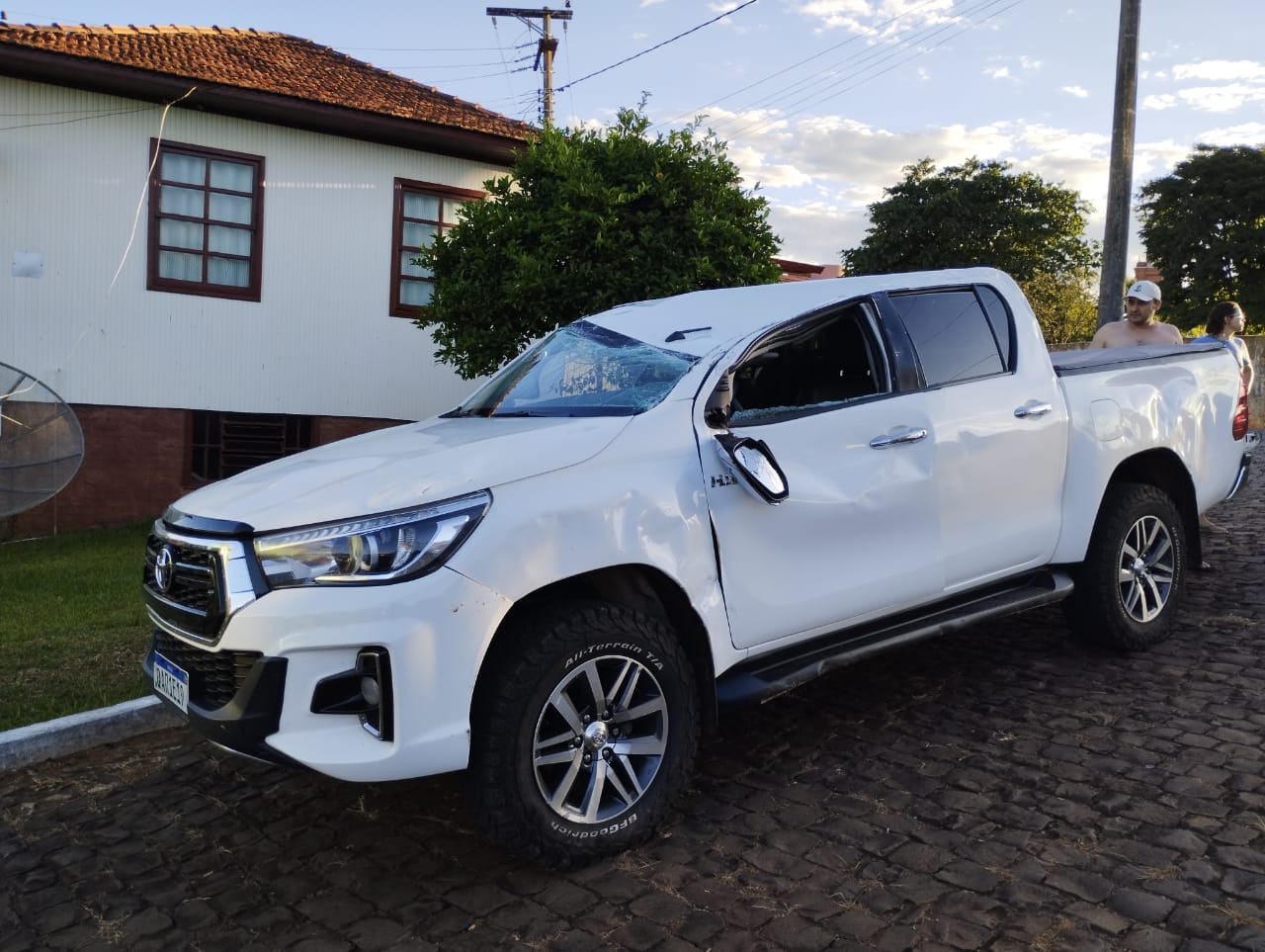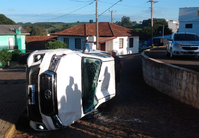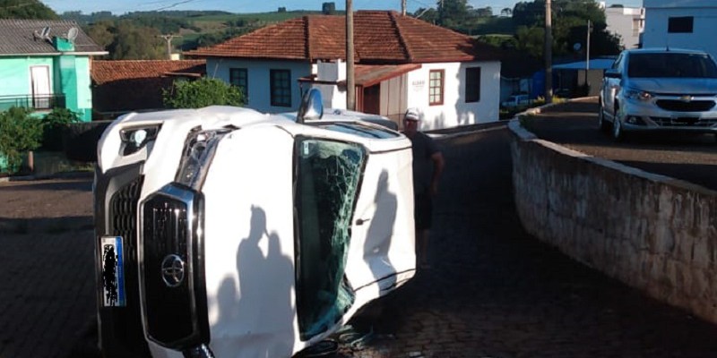 Uma caminhonete Toyota Hilux, branca, capotou na rotatória da Praça da Bandeira em Machadinho (Praça da Biblioteca), na tarde desta quinta-feira, dia 05 de janeiro de 2023, por volta das 18h20m.