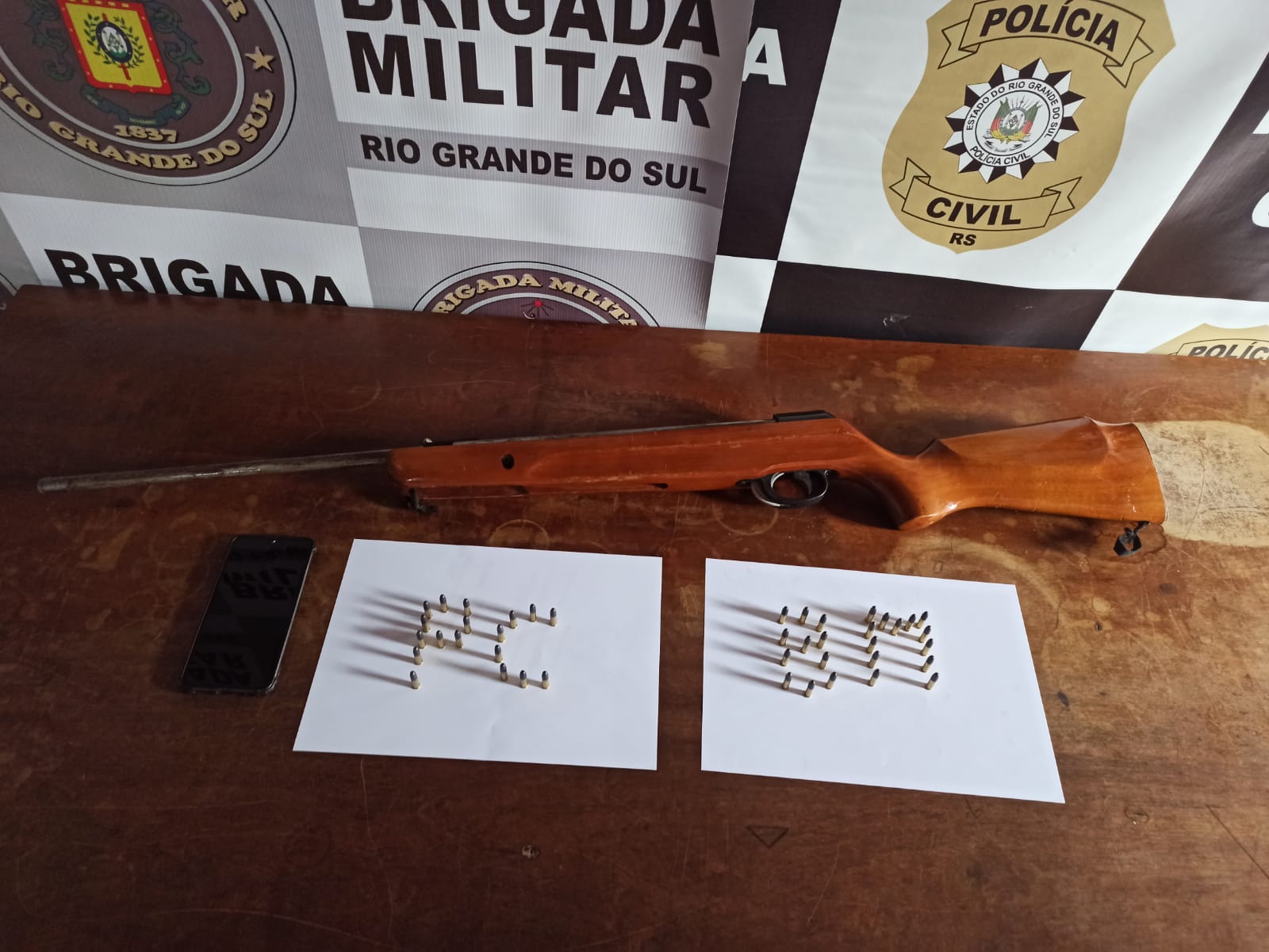 No local, foi apreendida uma espingarda – calibre 22, munições, um veículo Gol vermelho – com placas de Piratuba, SC, uma moto CB 300R, vermelha, placa de Concórdia, SC. Os dois veículos foram apreendidos, em virtude das adulterações que ambos possuíam.