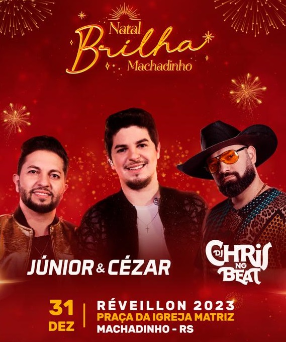 No dia 31 de dezembro, a partir das 22 horas, Machadinho será palco da maior festa da virada. A animação ficará por conta dos Djs do Music Dancing, e logo após, para a contagem regressiva, um super show nacional com a dupla Junior e César e Dj Cris no Beat, um dos fenômenos da atualidade.