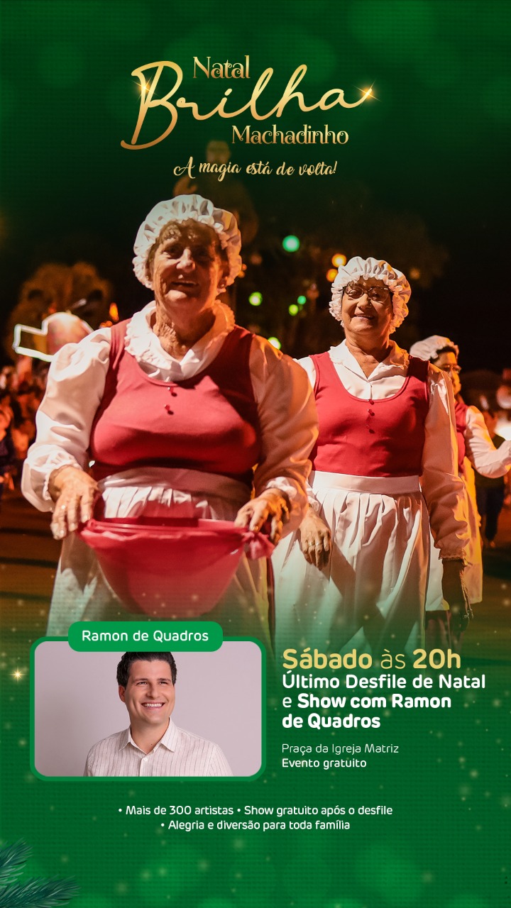 Se você, caro (a) leitor (a), por algum motivo não pôde prestigiar a primeira e a segunda edições do desfile, não fique triste, pois, neste próximo sábado, dia 18 de dezembro, haverá o terceiro e último desfile de Natal. Um verdadeiro espetáculo! Envolvendo mais de trezentas pessoas, que realmente encantam e emocionam o público presente, composto por milhares de pessoas, visitantes, turistas, além do povo machadinhense. Logo após o desfile, haverá Show Gratuito, na Rua Coberta, com Ramon Quadros.
